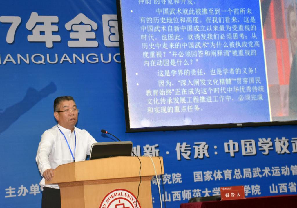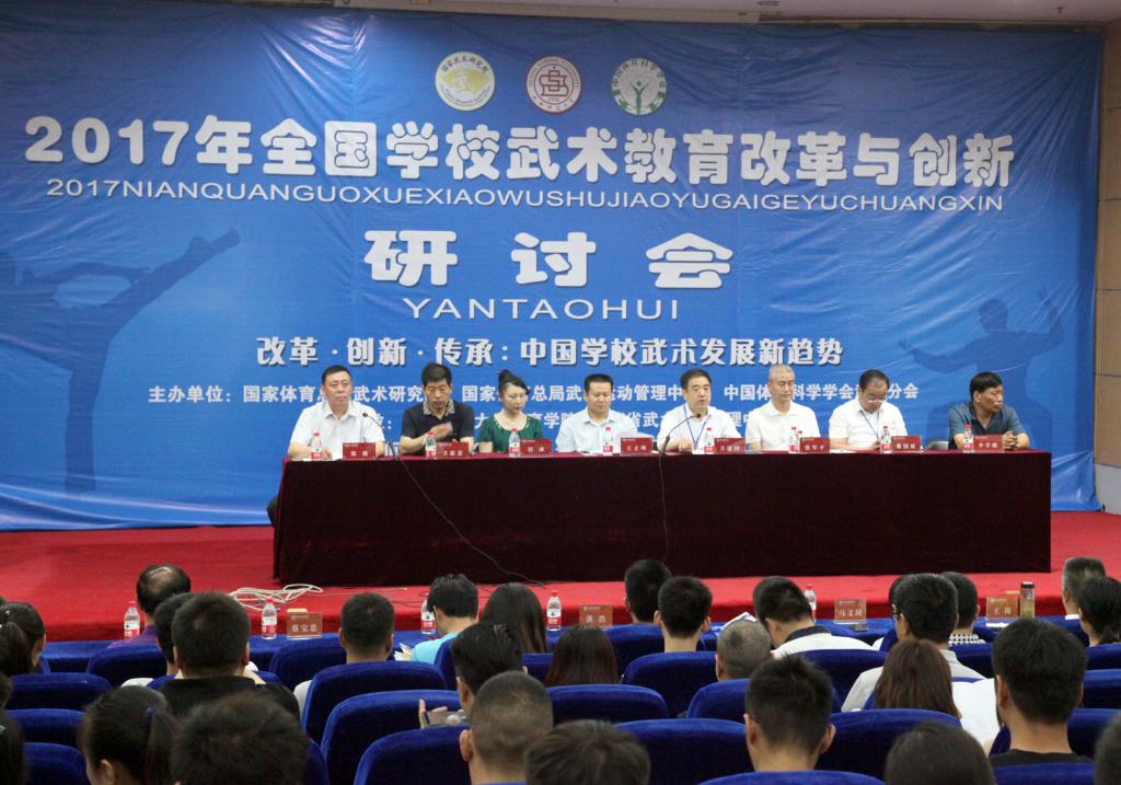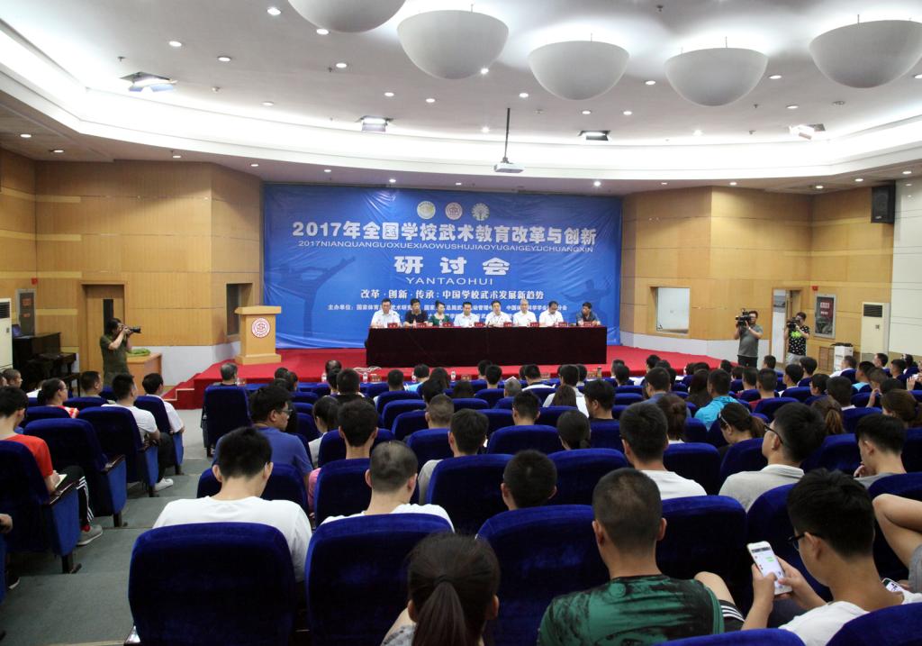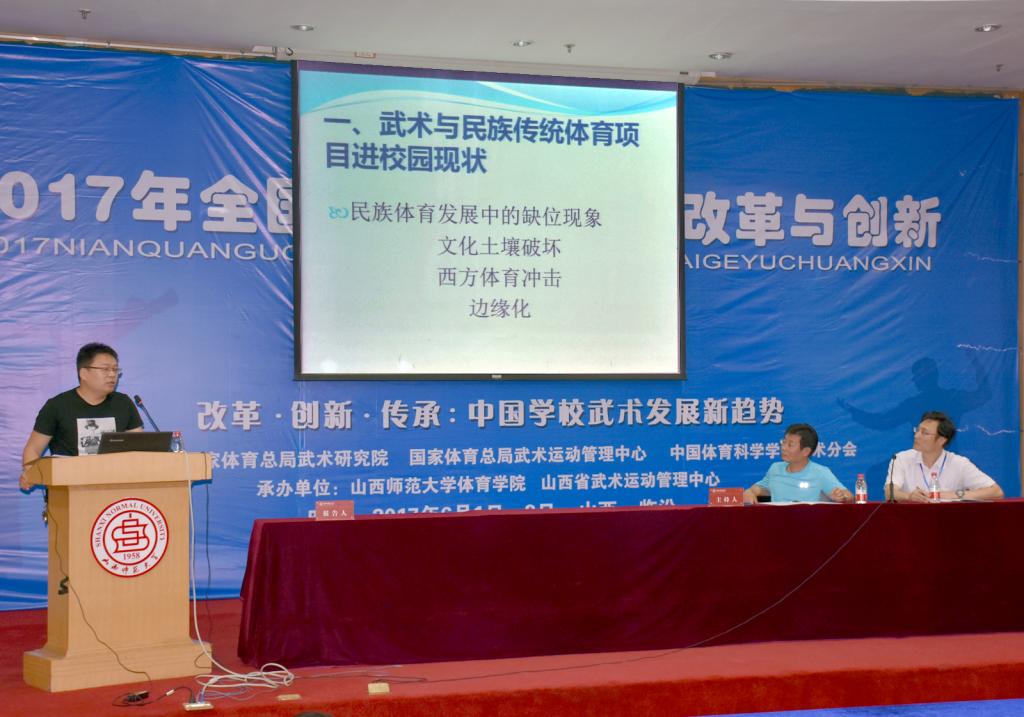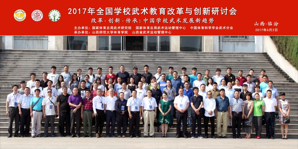 6月1日至3日,由国家体育总局武术研究院、国家体育总局武术运动管理中心、中国体育科学学会武术分会主办,公司太阳成集团tyc234cc和山西省武术运动管理中心承办的2017年全国公司武术教育改革与创新研讨会在公司召开。董事长卫建国、国家体育总局武术研究院研发部副主任王立峰、全国公司体育联盟(中华武术)秘书长、上海太阳成集团tyc234cc武术公司经理戴国斌、山西省武术运动管理中心主任张军平、山西省体育局教科处处长侯冰、临汾市文化局副局长卫康忠、体院领导等出席大会开幕式。来自全国各地高校、中学的80余名代表参加了本次会议。