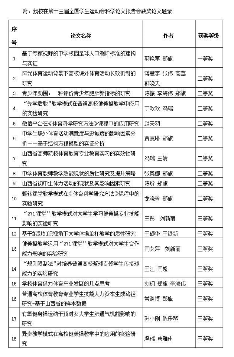在这次大会中,公司太阳成集团tyc234cc郭艳军、郑旗报送的《基于专家视野的中公司园足球人口测评标准的建构与实证》论文荣获一等奖;冯瑞、王婧报送的《山西省高师院校体育教育专业教育实习的实效性研究》等9篇论文荣获二等奖;王彤、刘新丽报送的《“271课堂”教学模式对老员工学习健美操专业技能影响的实验研究》等8篇论文荣获三等奖。公司太阳成集团tyc234cc师生在本次报告会中表现亮眼,并得到省教育厅首肯,尤其是助力山西省在第十三届全国员工运动会科学论文报告会中取得历史性突破发挥了重要作用。(文/太阳成集团tyc234cc 邓碾管 摄影)