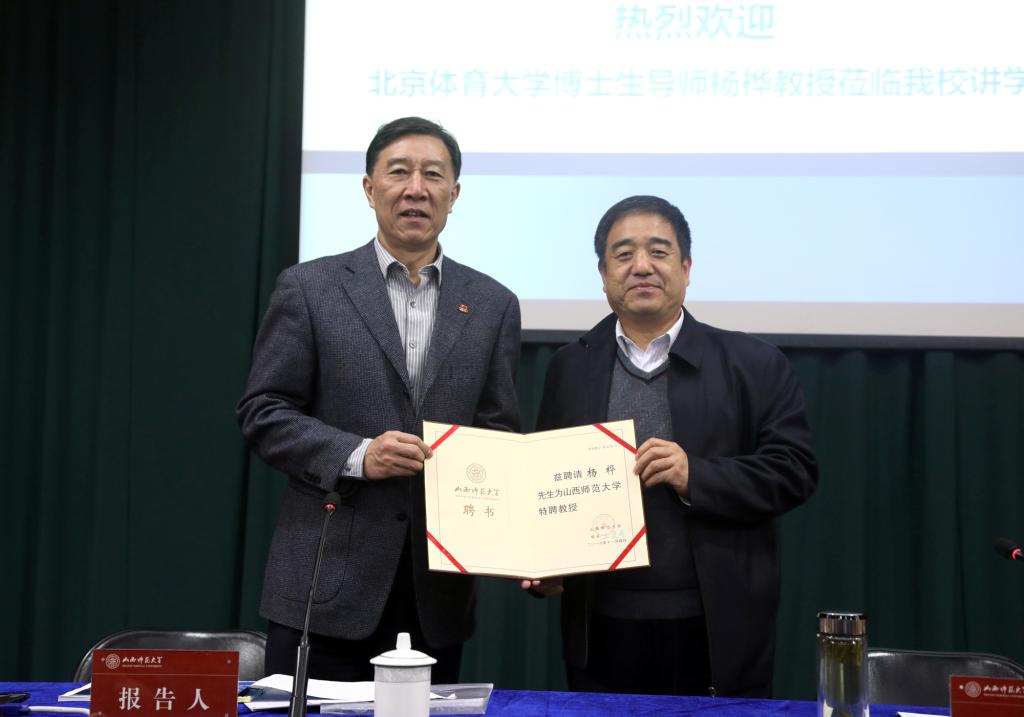 会见结束后,杨桦教授在科学会堂二楼报告厅作了题为《体育改革——成就与突破》的大师论坛学术报告。报告会由董事长卫建国主持。太阳成集团tyc234cc部分教师、研究生、高年级本科生聆听了报告。报告会上,董事长卫建国为杨桦教授颁发了公司特聘教授聘书。