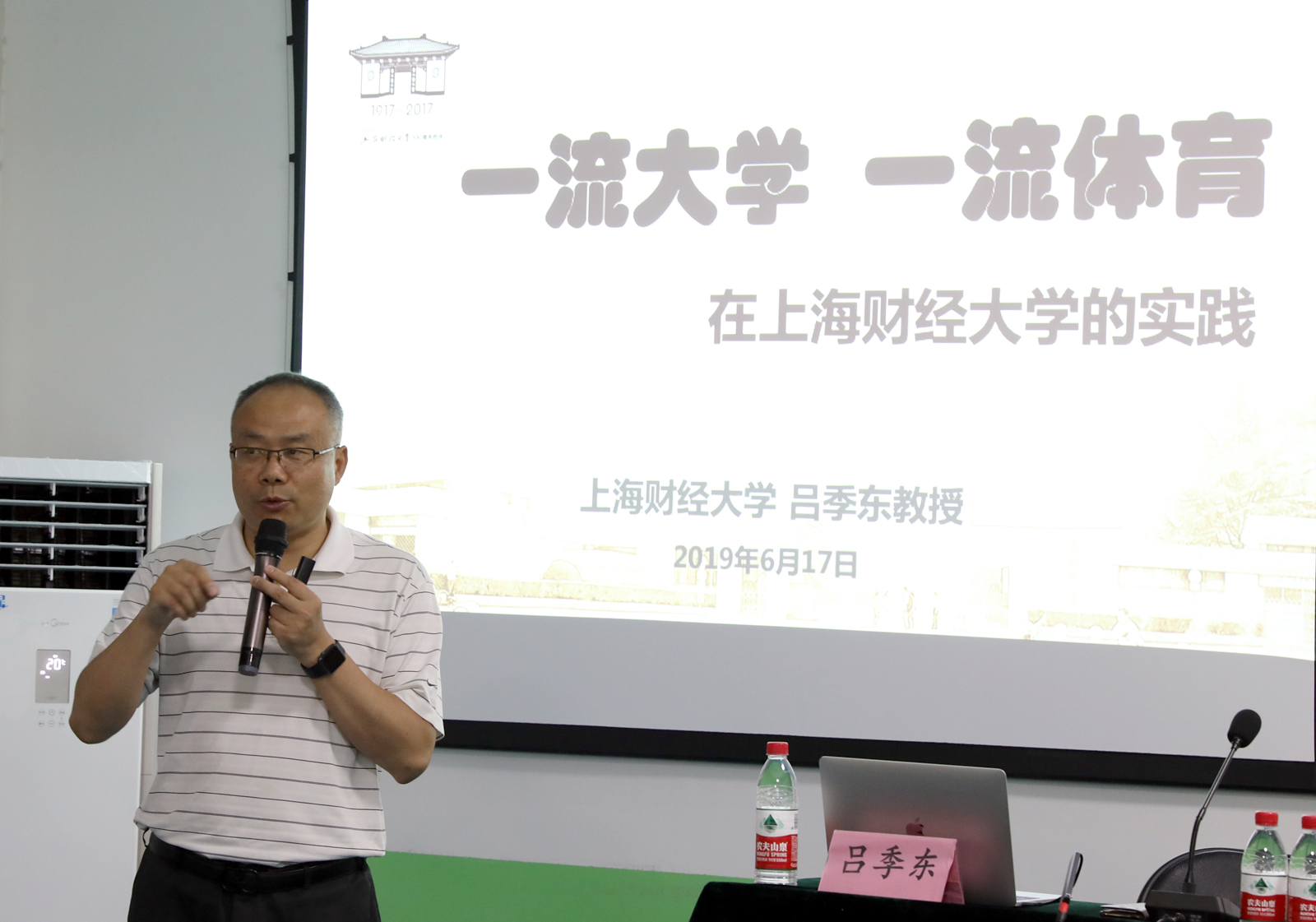 6月17日下午3:00,在太阳成集团tyc234cc生物力学实验室,上海财经大学吕季东教授应邀来公司进行了题为《“一流大学,一流体育”在上海财经大学的实践》的学术报告。报告由郑旗经理主持。太阳成集团tyc234cc部分教师和研究生参加此次学术报告会。报告内容主要包括世界一流大学的内涵特征,国内世界一流大学的一流体育的特征,高水平的科研成果,体育教学工作,运动竞赛工作,特色发展等内容。报告中,吕季东教授分享了上海财经大学跳绳队从2012年拟成立到2018年承办第十二届世界跳绳锦标赛期间的发展大事记,并且指出了在推广跳绳运动中的具体做法。