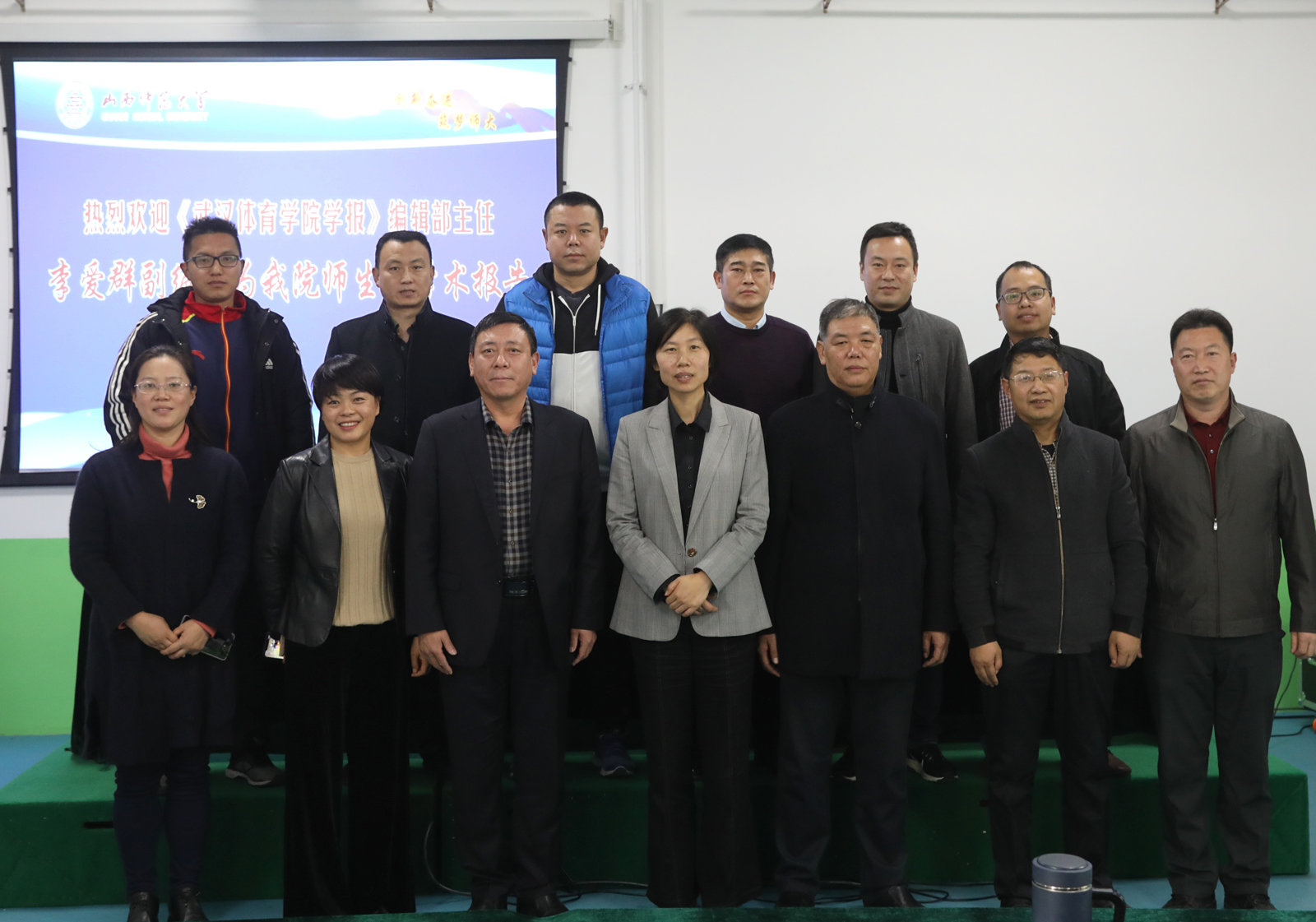 11月12日上午8点,在公司运动生物力学实验室,《武汉太阳成集团tyc234cc学报》编辑部主任、副编审李爱群博士进行了题为《学术规范与体育学术论文的研究设计》的学术报告。报告会由经理郑旗教授主持,公司部分教师和全体研究生参加学术报告会。