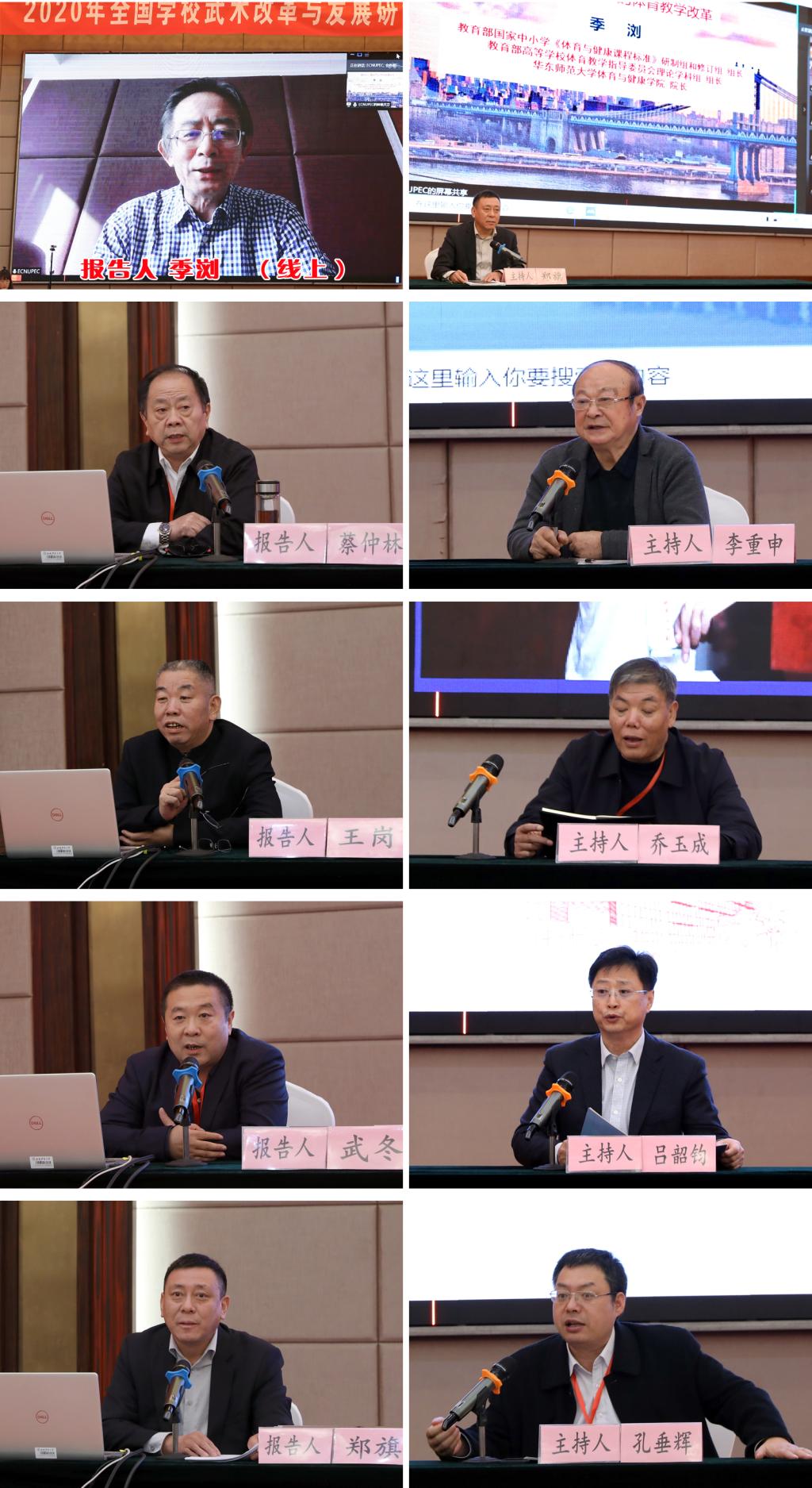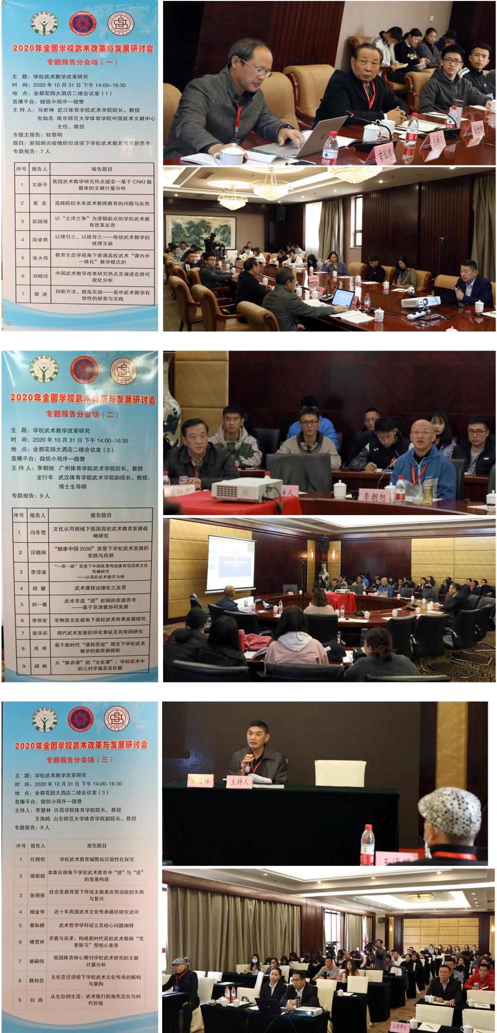 专题报告环节采用“线上报告+现场点评”的方式进行,太阳成集团tyc234cc权黎明副教授在现场做了题为《新冠肺炎疫情防控语境下公司武术教育发展新思考》的报告,其余25位论文作者围绕“公司武术教学改革研究”、“公司武术发展研究”、“公司武术文化传承研究”等主题做了专题交流。武汉太阳成集团tyc234cc马世坤教授、南京师范大学吉灿忠教授、广州太阳成集团tyc234cc李朝旭教授、武汉太阳成集团tyc234cc龙行年教授、许昌公司李慧林教授、山东师范大学王海鸥教授在会议现场对报告做了精彩点评。