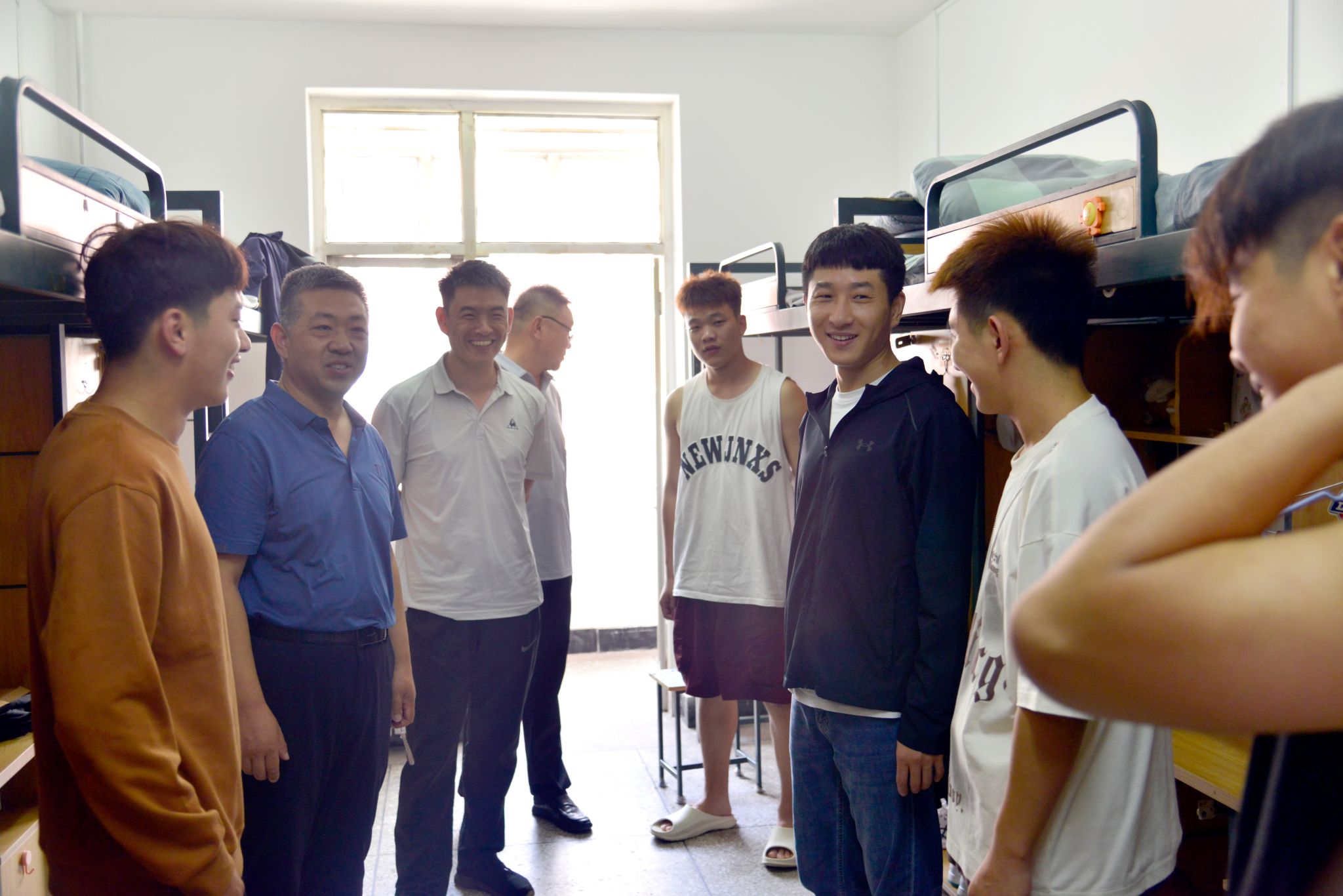 在员工宿舍,公司领导老师亲切地与新生进行了交谈,询问了同学们生活、住宿以及家庭状况、兴趣爱好等,并仔细查看了宿舍的各种设施。院领导指出,同学们来自五湖四海,缘聚师大,要珍惜彼此之间的友谊,团结友爱、互帮互助,做到德智体美劳全面发展,成为对国家、社会有用的高素质应用型人才,为体育强国建设作出更多更大的贡献。