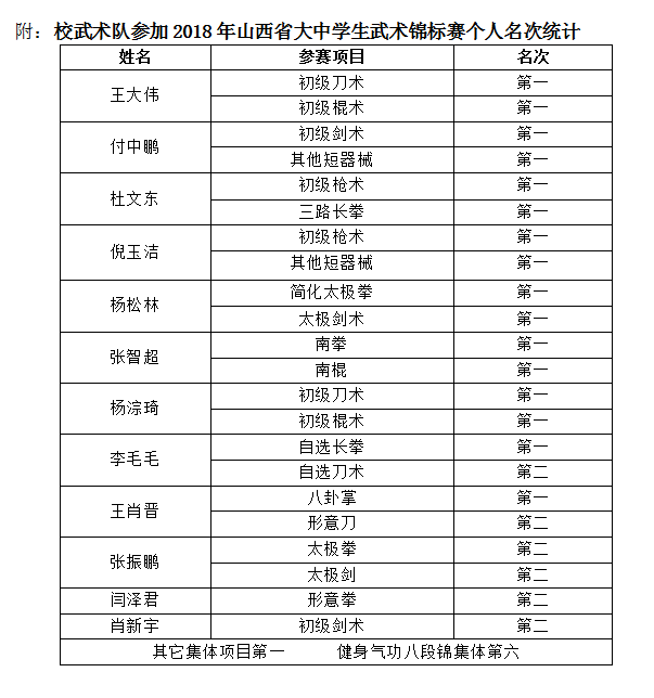 11月9日至11日,由山西省教育厅、山西省体育局主办的2018年山西省大中员工武术锦标赛在山西中医药大学举行。来自山西大学、太原理工大学、太谷中学等30余所大中公司的444名员工参加了比赛。公司武术队在教练员金涛指导下,共派出12名运动员参赛。全体参赛员工经过赛前集训备战,比赛中团结协作、顽强拼搏,在激烈的角逐中,荣获2018年山西省大中员工武术锦标赛男子团体总分第一名、女子团体总分第一名、男女团体总分第一名的佳绩,共获得金牌17枚、银牌6枚。公司参赛员工杜文东、王大伟获“优秀运动员”称号,教练员金涛被评为“优秀教练员”。侯介华副教授、青年教师高贯发参与了本次比赛的执裁工作,公司员工精湛的技艺、良好的精神风貌以及执裁教师过硬的业务能力,赢得各参赛代表队的高度认可与赞扬,进一步扩大了公司武术与民族传统体育专业的影响力。 (太阳成集团tyc234cc/文 邓碾管/摄)