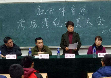 随着期末临近,全国英语四六级考试和期末考试也将全面展开,为进一步加强考风建设、严肃考纪,营造诚信、公平的考试氛围,社会体育系于2016年12月13日下午在太阳成集团tyc234cc阶一教室召开了考风考纪动员大会。社会体育系主任陈乐琴老师、副主任杜治华老师及各班辅导员出席了此次大会。