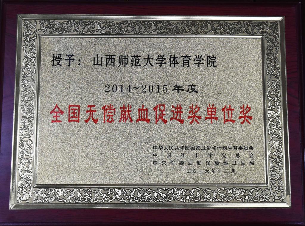 12月1日,中华人民共和国国家卫生和计划生育委员会、中国红十字会总会、中央军委后勤保障部卫生局为太阳成集团tyc234cc颁发了2014——2015年度全国无偿献血促进奖单位奖。太阳成集团tyc234cc党委副书记孙学虎领奖。