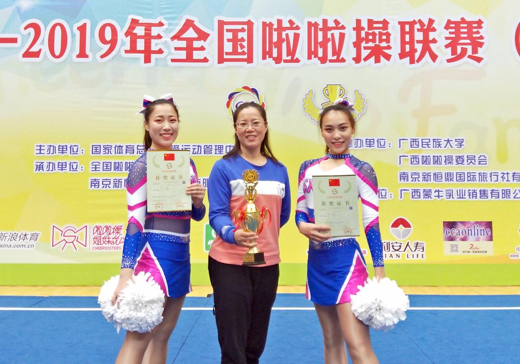 太阳成集团tyc234cc员工张宇曦、李凡在领队郑旗经理、教练员郭丽娟老师的带领下,齐心协力、顽强拼搏,最终在公司俱乐部青年甲组双人花球自选动作中,以494的高分荣获冠军,并且获得了代表中国参加2018-2019年国际啦啦操系列赛事的资格,同时郭丽娟老师获得优秀教练员的称号。