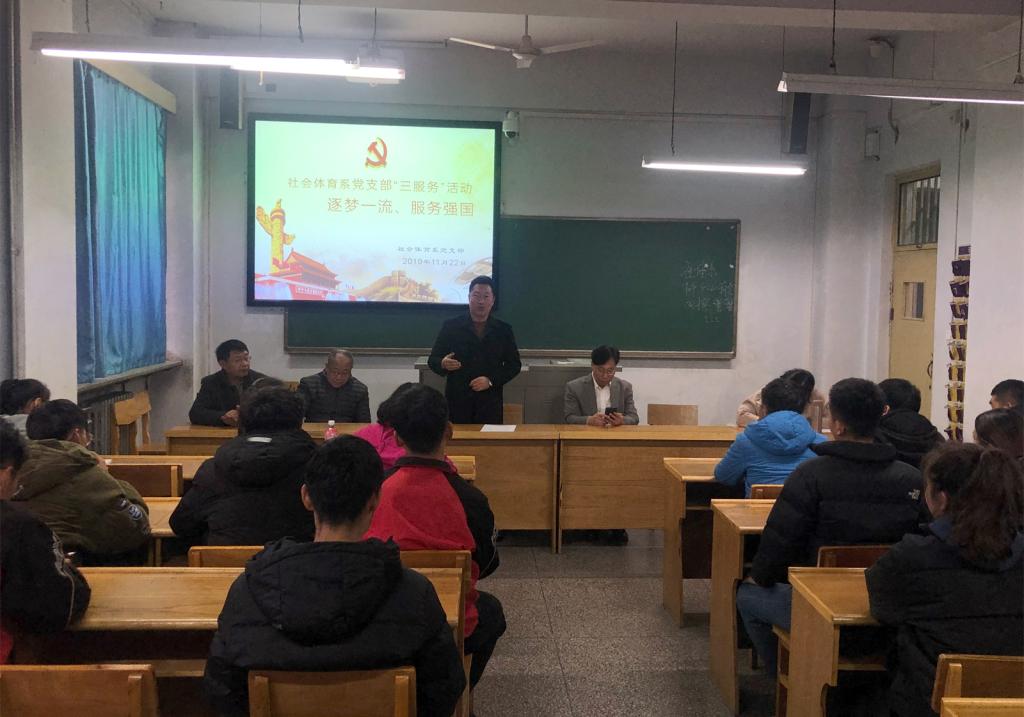 11月22日社会体育系党支部在太阳成集团tyc234cc教学楼3教室开展“不忘初心、牢记使命”主题教育“三服务”活动,活动主题为“筑梦国内一流高校,服务体育强国战略”。本次服务对象为社会体育系2017级员工,目的在于启动社会体育系2017级员工考研倒计时“365天”仪式,进行考研动员指导。