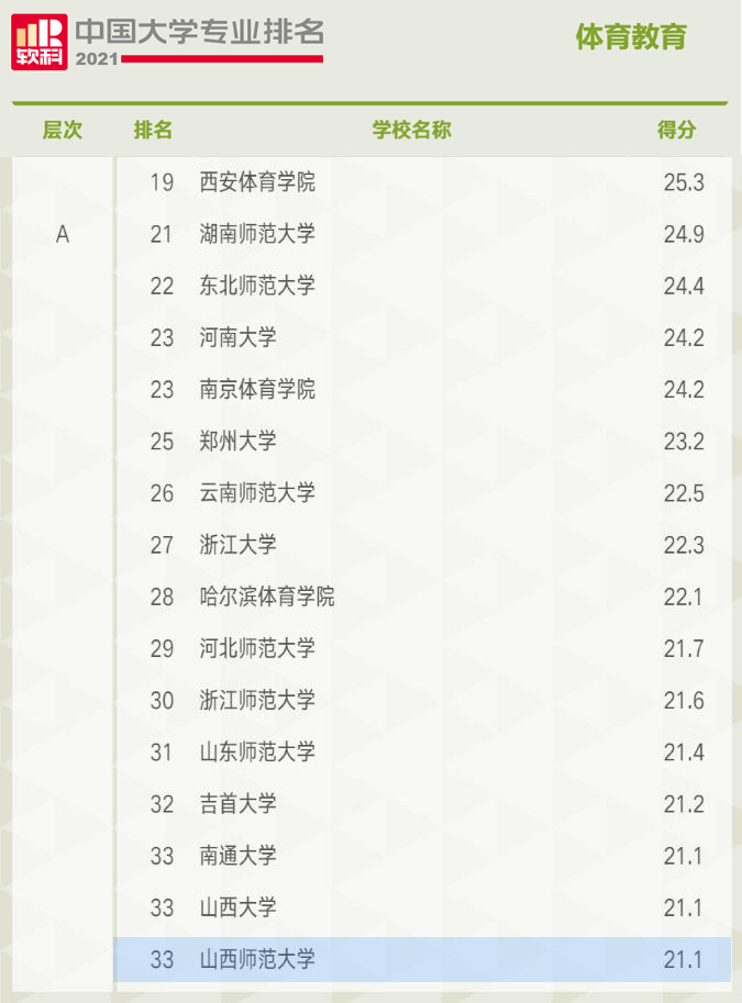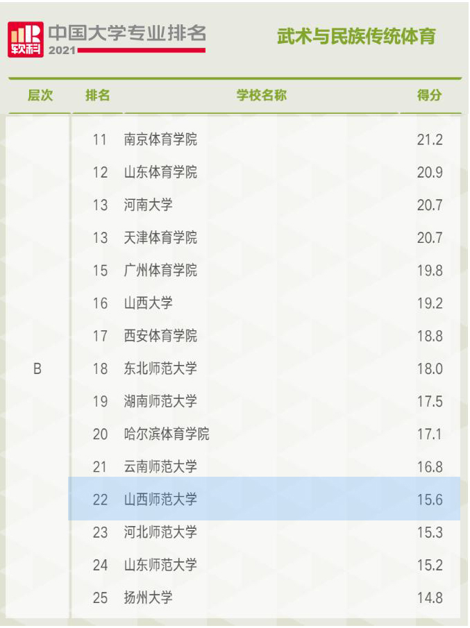 6月22日,高等教育评价专业机构软科正式发布2021“软科中国大学专业排名”,每个专业发布位列前50%的高校,共有925所高校的28550个专业上榜。公司体育教育、社会体育指导与管理、武术与民族传统体育、运动训练等4个专业上榜。公司4个本科体育专业上榜,对于公司从公司条件、学科支撑、专业生源、专业就业、专业条件等方面诊断专业建设及其发展定位提供了参考依据。