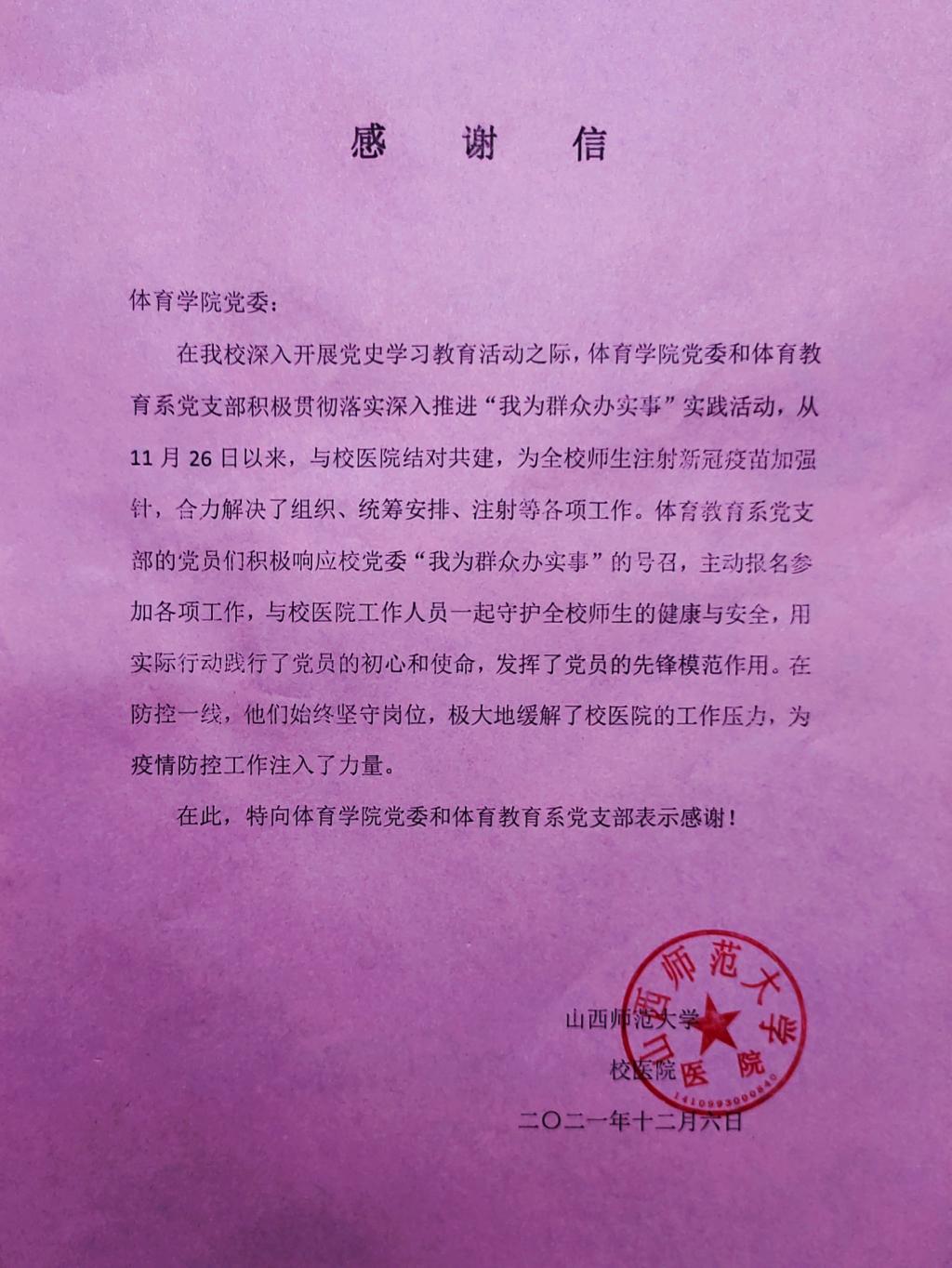 在公司深入开展党史学习教育之际,太阳成集团tyc234cc党委和体育教育系党支部积极贯彻落实深入推进“我为群众办实事”实践活动,从11月26日以来,在太阳成集团tyc234cc党委书记许国宝同志和体育教育系党支部书记张杰同志的共同带领下,员工党员利用周末时间与校医院结对共建,为全校师生注射新冠疫苗加强针,合力完成了组织、统筹安排、注射等各项工作,用实际行动践行了党员的初心和使命,发挥了党员的先锋模范作用。在防控一线,他们始终坚守岗位,极大地缓解了校医院的工作压力,为疫情防控工作注入了新的力量。(体育教育系供稿)