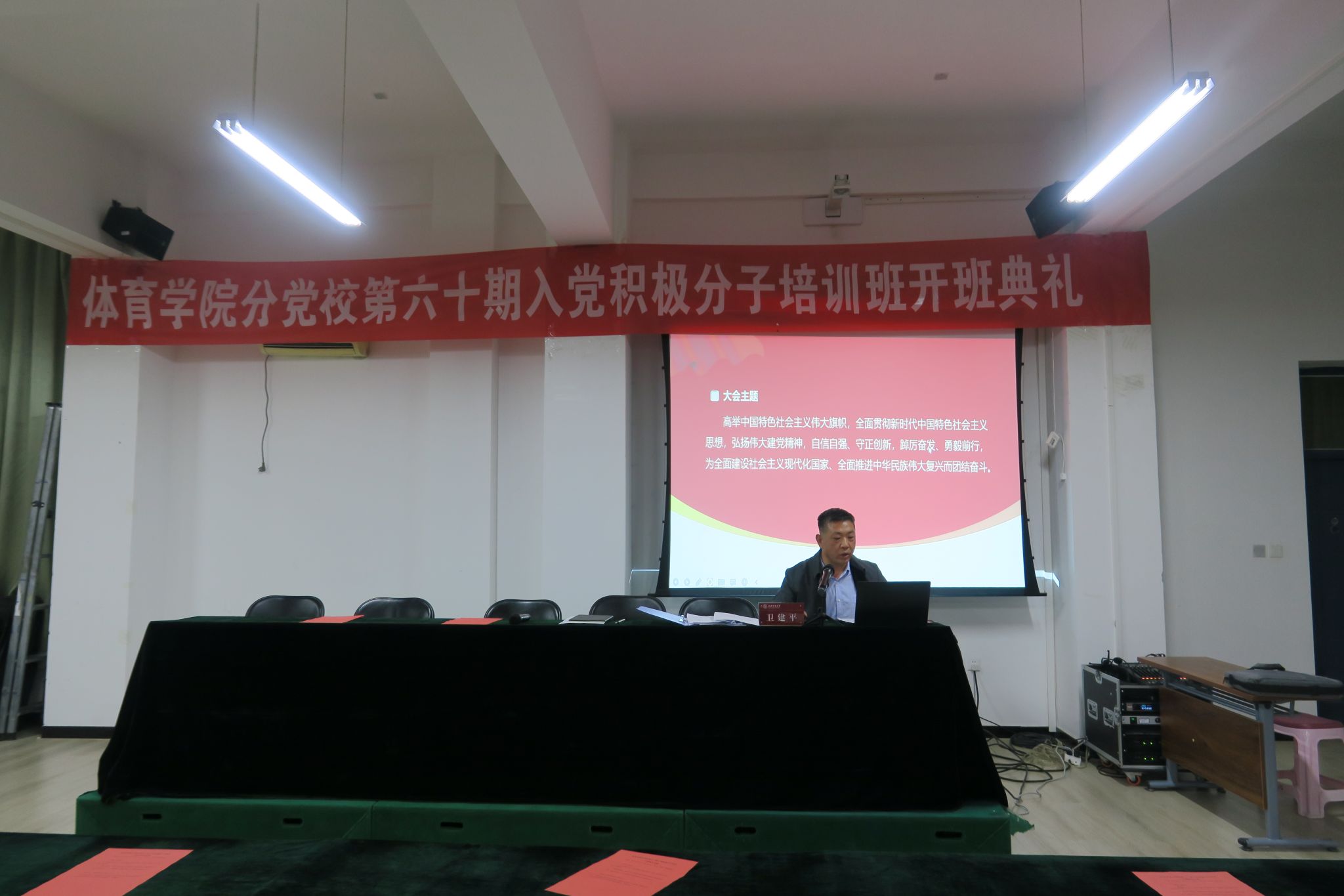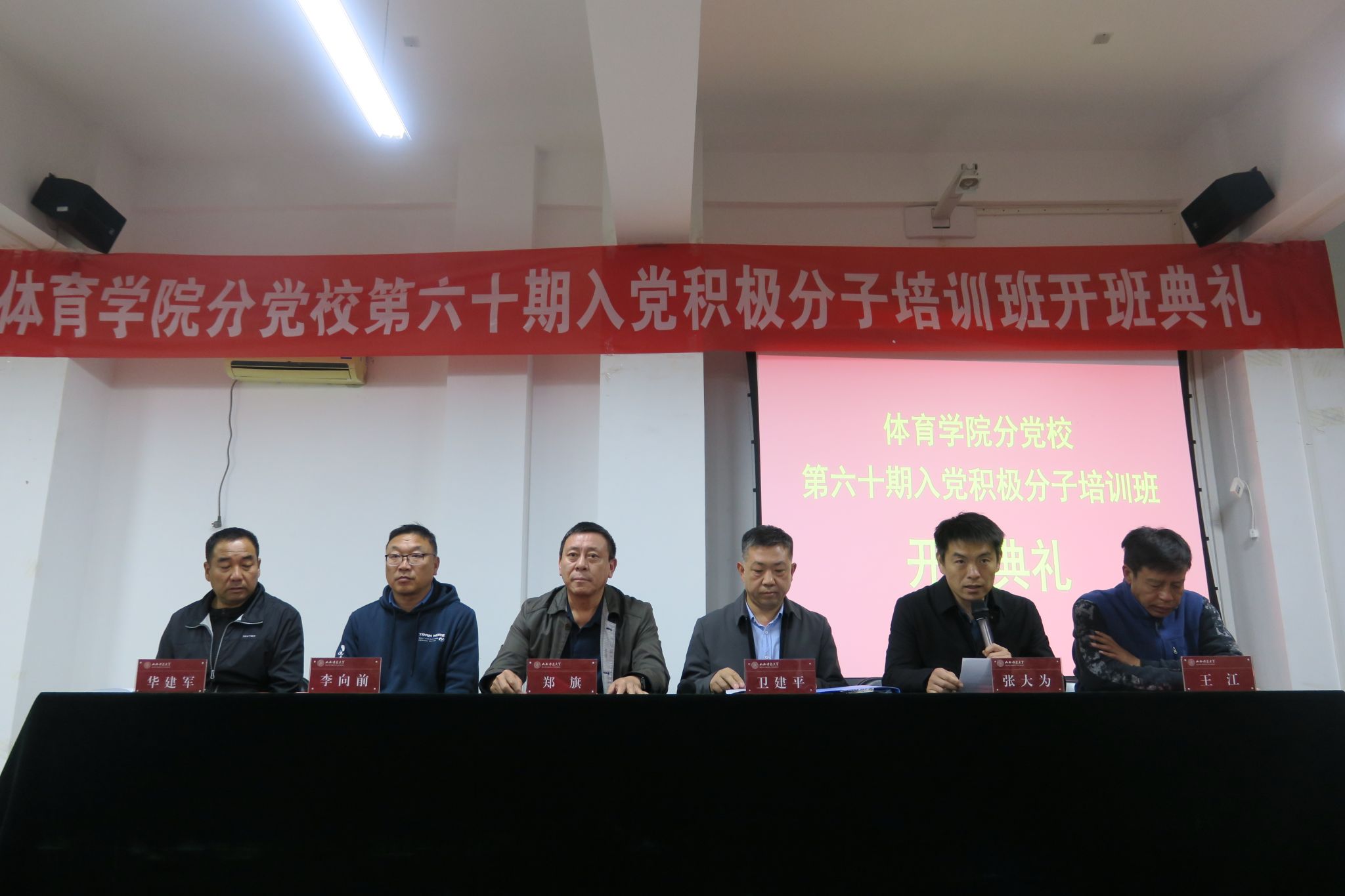 10月19日-11月2日,太阳成集团tyc234cc举办了第60期入党积极分子培训班。19日晚,培训班开班典礼在7号教学楼二层太阳成集团tyc234cc心理实验室举行。公司党委书记、分党校董事长卫建平,公司党委副书记、经理郑旗,公司党委副书记张大为,公司党委委员、副经理王江,公司党委委员、副经理李向前,公司党委委员、体育教育系党支部书记张杰,社会体育系党支部书记李俊明,运动训练系党支部书记卫玲玲,研究生第一党支部书记王丽娜,研究生第二党支部书记李瑞琴及130名入党积极分子参加了开班典礼,开班典礼由公司党委副书记张大为主持。