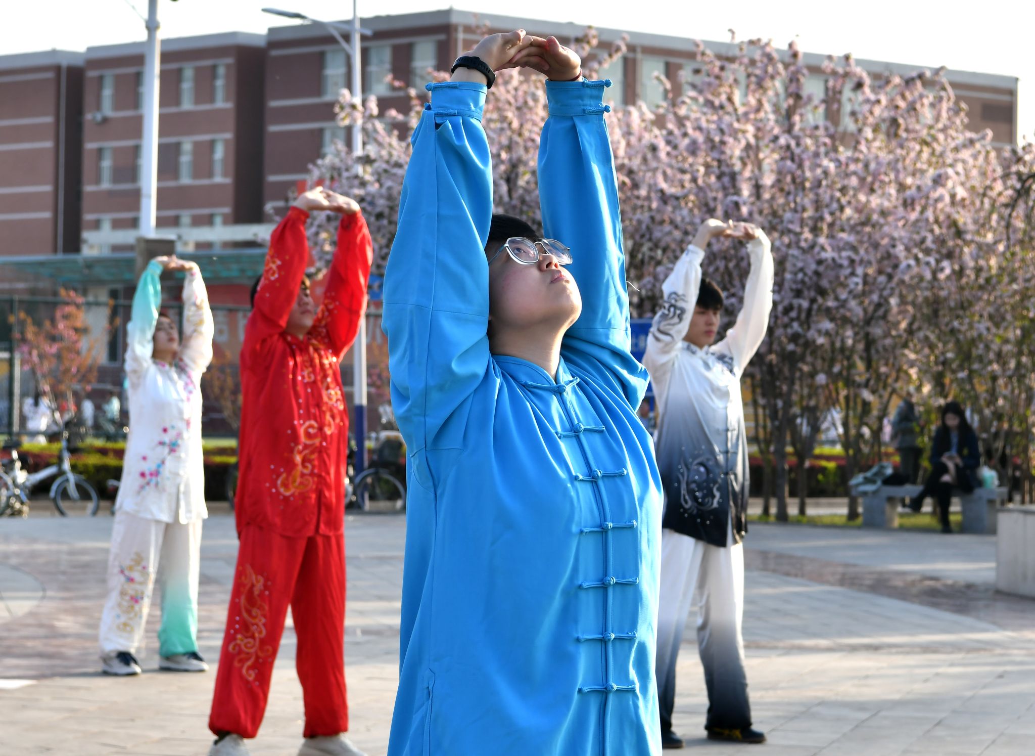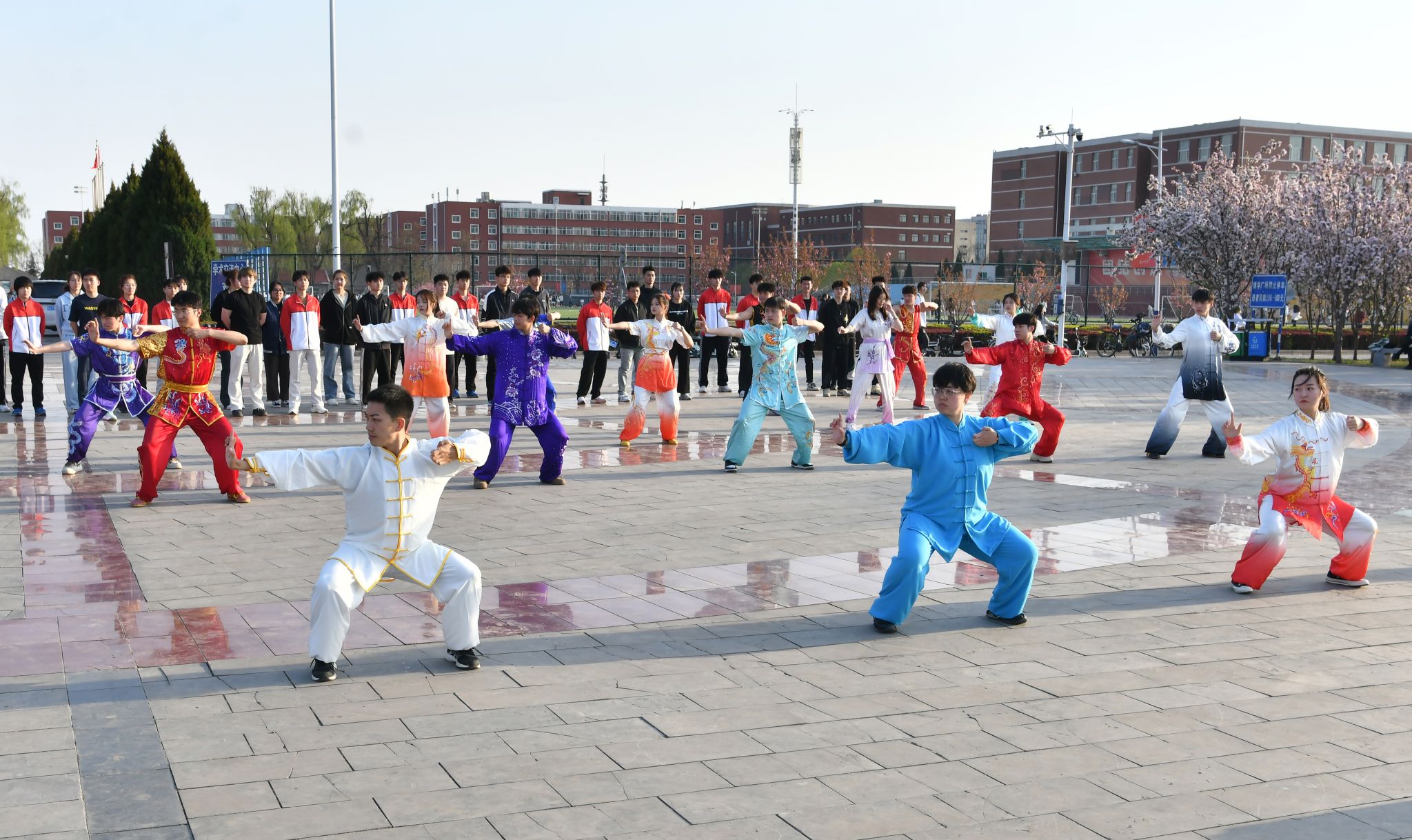 春风拂面,碧波荡漾。在美丽的毓秀湖畔,伴随着悠扬舒缓的音乐,行知社区太阳成集团tyc234cc的同学们气定神闲地舒展肢体,通过形体运动与神、意、气的配合,动作优美、整齐划一的展示八段锦的神韵与内涵。