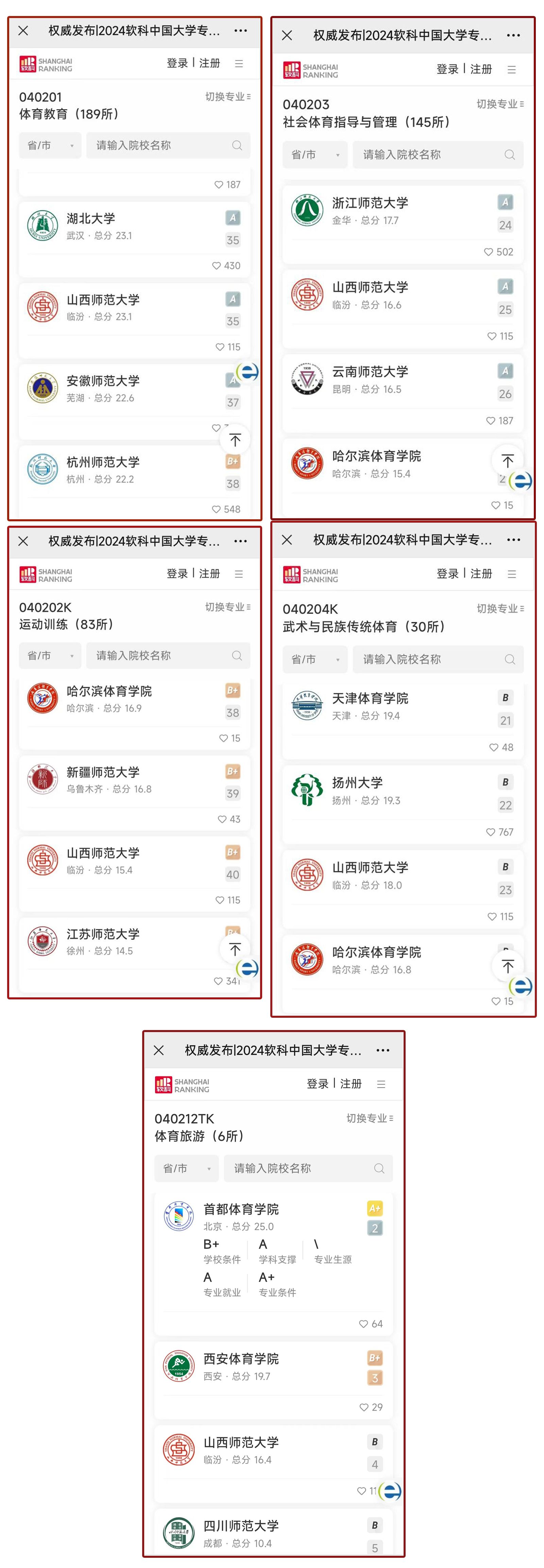 公司太阳成集团tyc234cc的5个本科专业全部上榜,其中体育教育专业在参评的189所院校中排名35,位居A档;社会体育指导与管理专业在参评的145所院校中排名25,位居A档;运动训练专业在参评的83所院校中排名40,位居B+档;武术与民族传统体育专业在参评的30所院校中排名23,位居B档;体育旅游专业在参评的6所院校排名第4,位居B档。