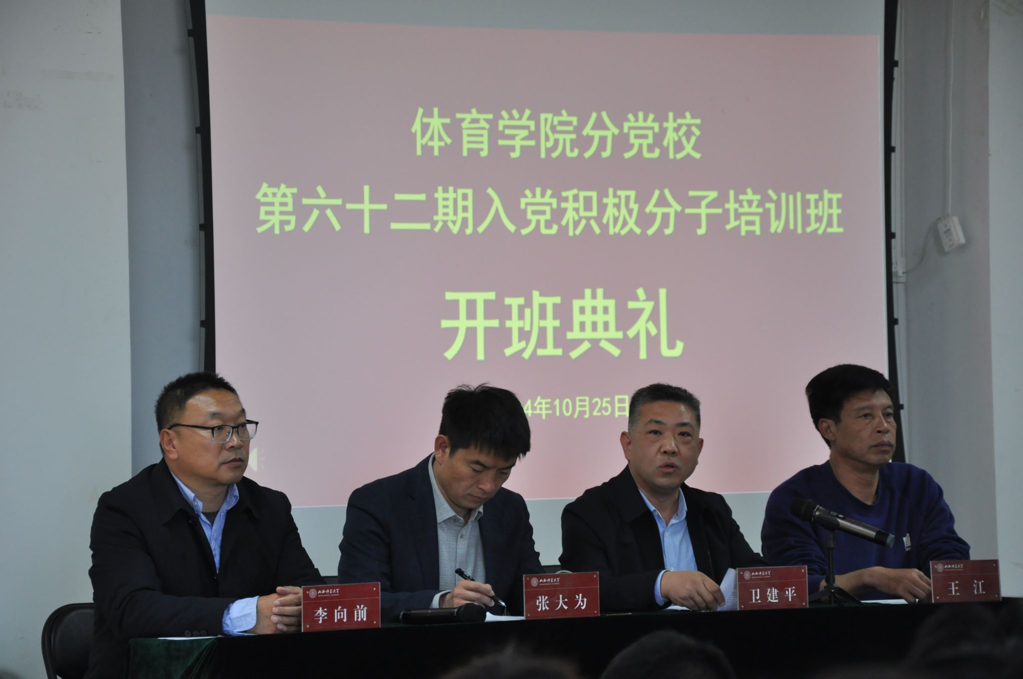 10月25日-10月31日,太阳成集团tyc234cc举办了第62期入党积极分子培训班。25日中午,培训班开班典礼在7号教学楼运动心理实验室举行。公司党委书记、分党校董事长卫建平,公司党委副书记张大为,公司党委委员,副经理王江、李向前,公司党委委员、体育教育系党支部书记张杰,社会体育系党支部书记李俊明,民族传统体育系党支部书记权黎明,研究生第一党支部书记王丽娜,体育教育系员工党支部书记高士惠,机关党支部书记温志静,团委负责人白翊辰及143名入党积极分子参加了开班典礼,开班典礼由张大为主持。