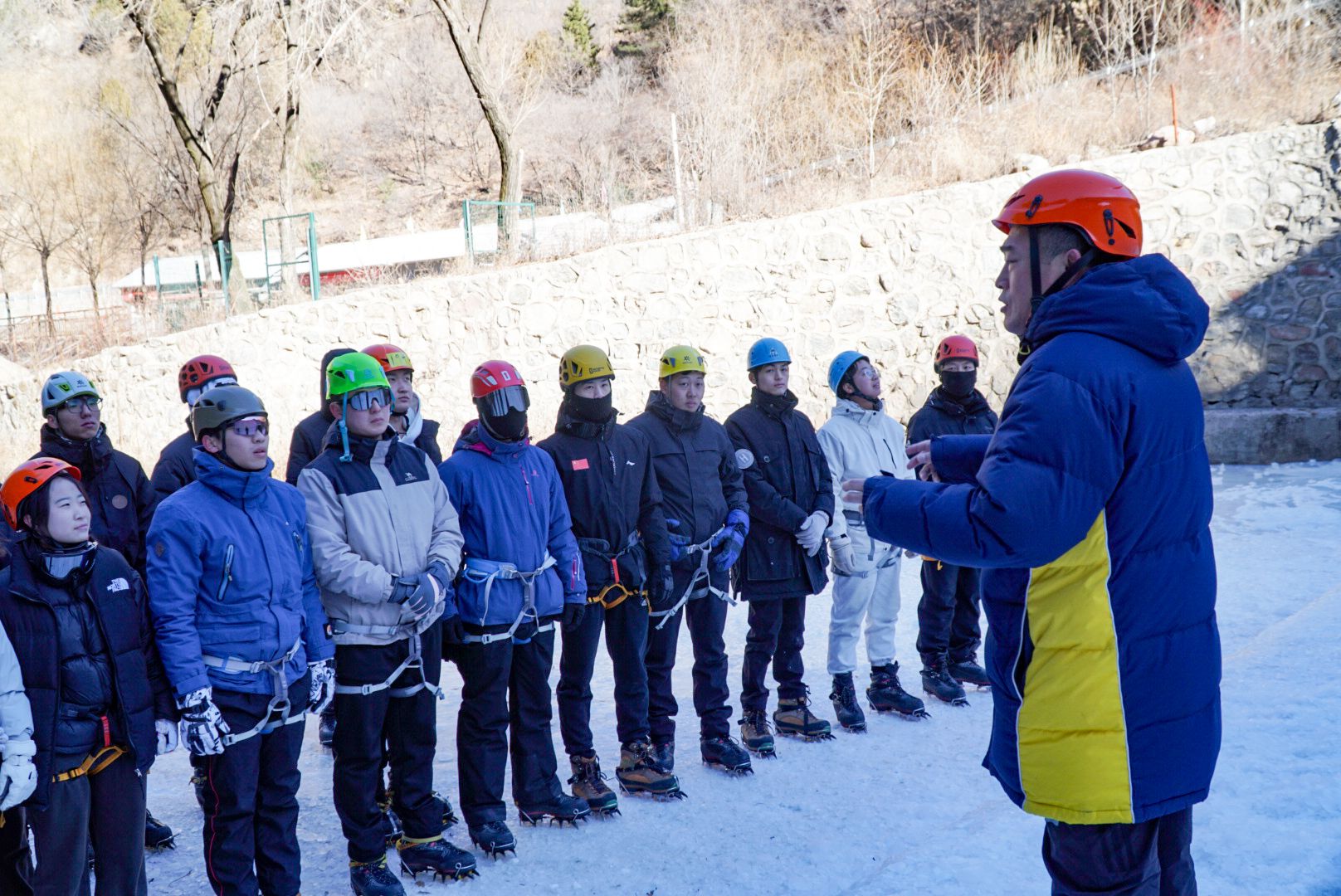 实践活动在紧锣密鼓的理论教学中拉开帷幕。李永生和武跃文老师详细地为同学们介绍了攀冰所需的各种装备,从冰鞋的选择与穿着技巧、冰镐的种类与使用方法,到头盔的重要性以及各种锁具、绳子的功能与操作规范,无一遗漏。老师们通过实物展示、现场演示等方式,深入浅出地讲解着每一个知识点,同学们则全神贯注地聆听、记录,手中不时摆弄着这些即将陪伴他们征服冰壁的“伙伴”,对攀冰的初步认知在心中逐渐构建起来。