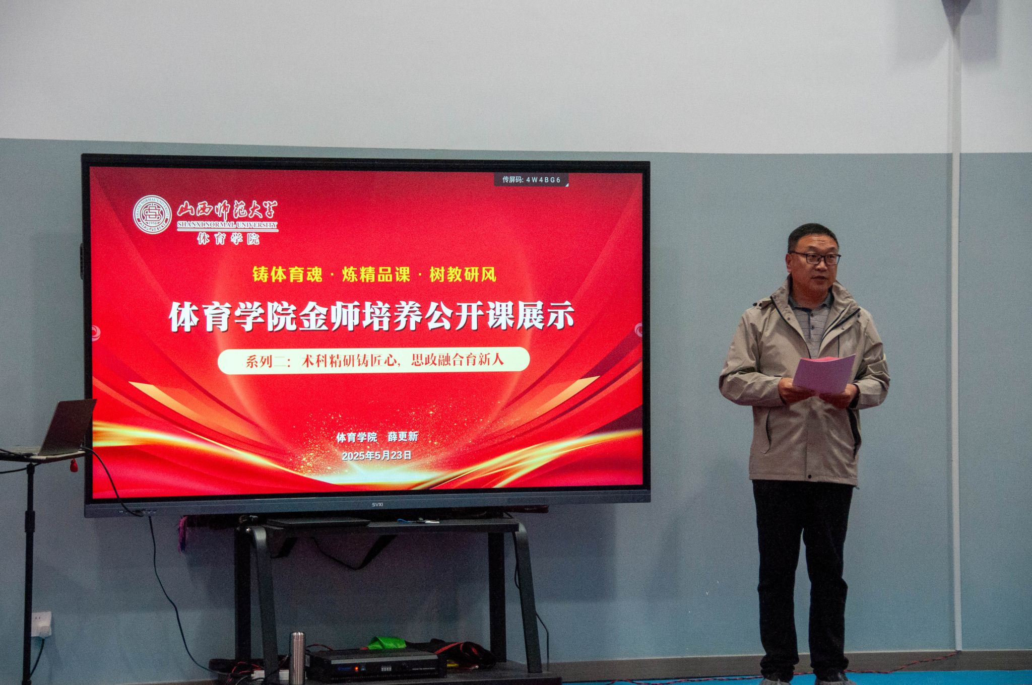 赵海涛老师对薛更新老师的教学进行了点评,认为薛更新老师思想上高度重视本次公开课的开展,教学准备充分,教姿教态得体,教学设计合理,示范动作规范;同时从专业角度提出两点建议:(1)思政元素的融入应结合典型案例更具说服力,(2)在武术套路教学中,应重点讲解“八法”即“手眼身法步,精神气力功”。