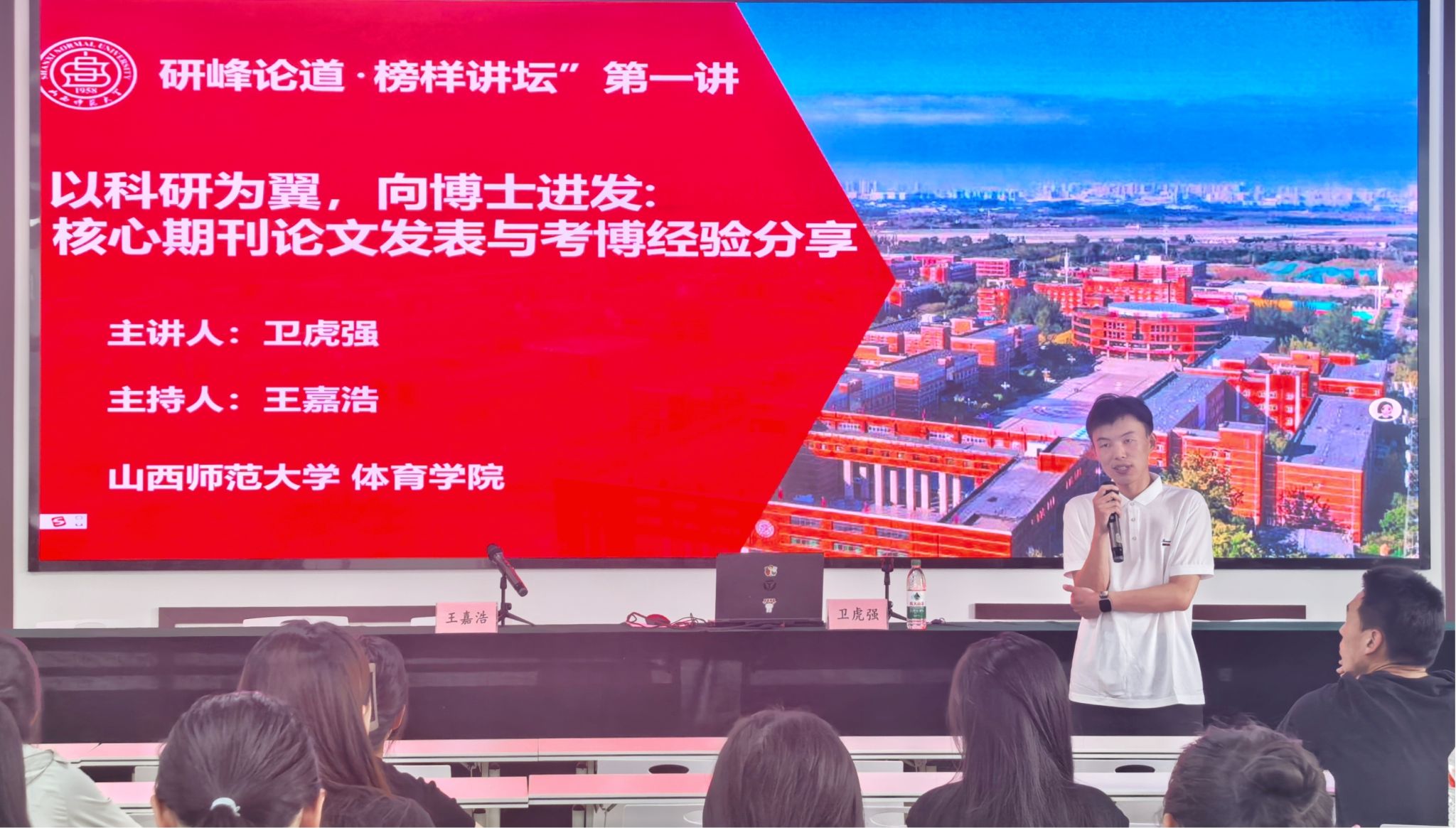 针对考博准备,卫虎强给同学们详细介绍了自己申请的华东师范大学、北京体育大学等多所高校的博士报考流程。他认为,核心期刊论文发表是考博成功的重要支撑,并以《体育科学》《北京体育大学学报》等期刊为例,具体分析了投稿要求与注意事项。讲座尾声,他以"长风破浪会有时,直挂云帆济沧海"寄语在场同学坚持学术理想。