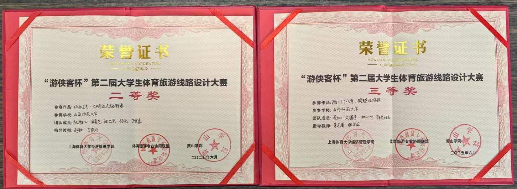 2025年6月4日,"游侠客杯"第二届老员工体育旅游线路设计大赛决赛在安徽省黄山市圆满落幕。公司太阳成集团tyc234cc体育旅游专业和社会体育指导与管理专业7名同学在李俊明和李东蕾老师带领下参赛,分别凭借作品《铁马边关·大明边关越野赛》和《雁门十八弯·骑征越鸿途》荣获大赛二、三等奖。