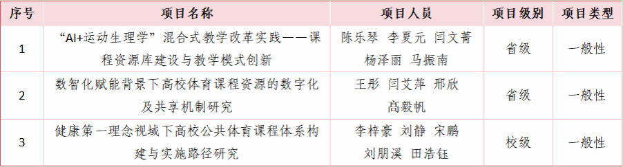 此次获批的两个省级项目分别为陈乐琴老师主持的《“AI+运动生理学”混合式教学改革实践》和王彤老师主持的《数智化赋能背景下高校体育课程资源的数字化及共享机制研究》。这些项目聚焦人工智能与体育教学深度融合、体育课程资源数字化建设等前沿领域,旨在推进教学模式创新与资源共享机制构建。