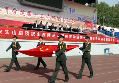 伴随着《运动员进行曲》,国旗班、彩旗方队、各系团体操方队、裁判员方队和各班辅导员带领的46个班级组成的运动员代表队,踏着整齐的步伐进入运动场,他们英姿飒爽,意气风发,代表了体院学子对运动会的关注与热情。在庄严的国歌声中,全体师生肃立,向国旗行注目礼!