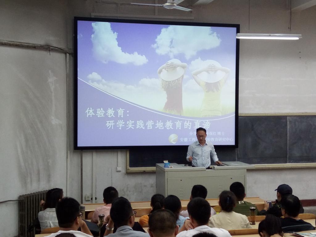 上午8:30培训正式开始,首先由院团委副书记程祖浩老师主持了开幕式,随后薛保红教授围绕研学旅行的涵义、理论基础知识和实践操作方法三个方面做了演讲报告,整个上午同学们以热情饱满的状态聆听着薛教授的精彩演讲。下午两点开始转入室外实践活动环节,薛教授带领同学们做了两项破冰游戏,充分调动了同学们的积极性,使每个人的动手能力、语言表达能力、思维能力、组织能力等方面得到了提高。