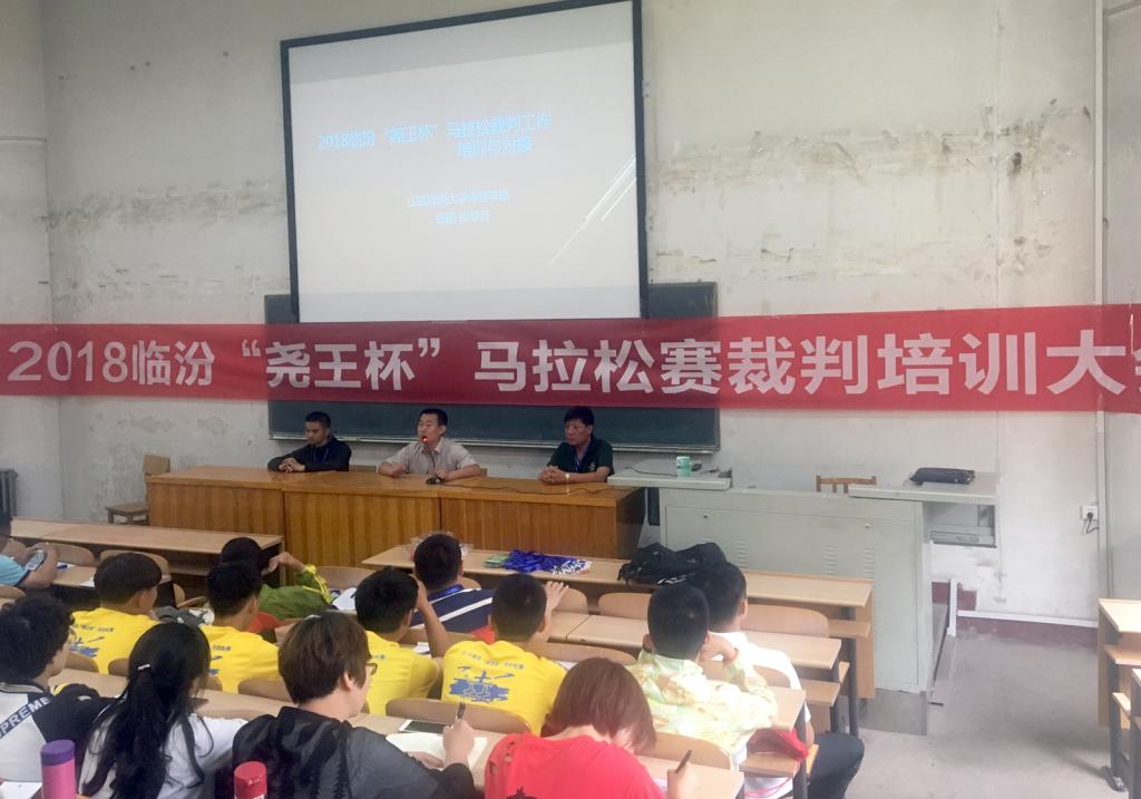 本届马拉松赛事是临汾市首次举办,加之马拉松赛路线长、时间长、参与人数多、参赛运动员水平差异大、赛道开放等诸多因素,给此次裁判执裁工作带来了较多压力,为了能顺利完成裁判任务,公司领导非常重视,于5月25日上午在体院阶一教室举行了“2018临汾’尧王杯’马拉松赛裁判培训大会”,副经理卢向阳出席了本次培训会,并做了讲话,同时提出了要求与希望。会上,竞赛主管、田径国家级裁判员张振副教授部署了本届马拉松赛裁判工作,明确了裁判分工与定位,详尽讲解各裁判组工作任务与职责。