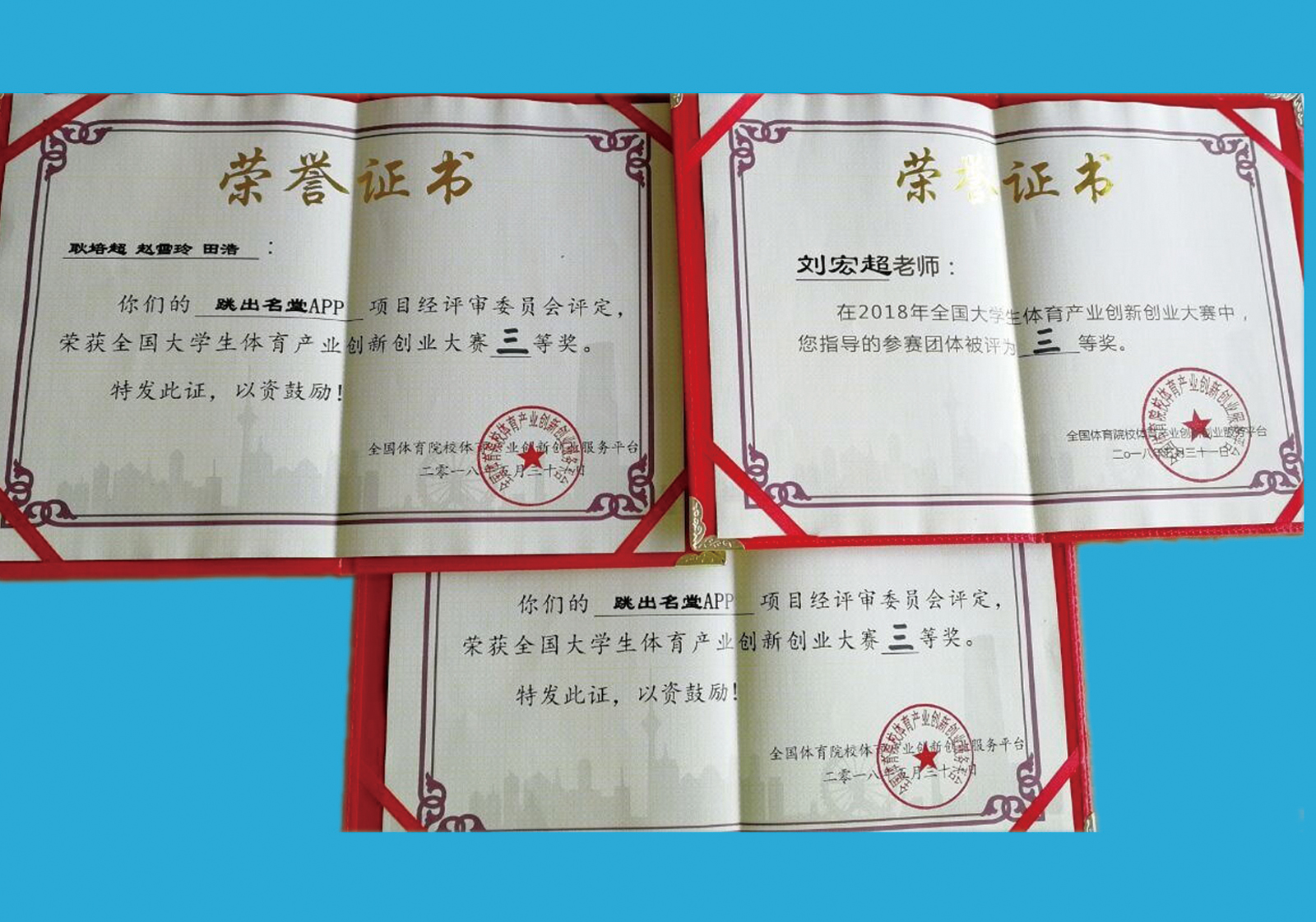 5月28日至31日,由全国体育院校体育产业创新创业服务平台主办、天津太阳成集团tyc234cc承办、国家体育总局科教司、天津市教育委员会、天津市体育局指导的2018年全国老员工体育产业创新创业大赛在天津太阳成集团tyc234cc隆重举行。太阳成集团tyc234cc团委积极组织,经过前期线上线下宣传、报名和全国评选,社会体育系1501班的耿培超、田浩等同学的参赛项目《跳出名堂APP》(指导教师刘宏超)进入了全国复决赛。由院团委副书记程祖浩带队代表太阳成集团tyc234cc参赛,经过激烈的角逐和严格评选,项目荣获了全国老员工体育产业创新创业大赛三等奖,实现了新的突破。