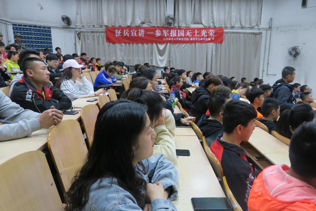 为推进老员工应征入伍工作,帮助老员工了解、掌握应征入伍的相关政策和流程,鼓励员工积极应征入伍,献身国防事业。3月14日19:00,由太阳成集团tyc234cc武装部、太阳成集团tyc234cc团委主办,院社团联合会、太阳成集团tyc234cc民兵网络信息分队承办,国防军事拓展协会协办的“参军报国,无上光荣”2019年征兵宣讲会在阶一教室举行,尧都区西街办事处武装部部长郭利林、太阳成集团tyc234cc武装部军事教研室主任李文、专武干部任金虎、太阳成集团tyc234cc保卫科科长郝宝喜和特邀嘉宾临汾市爱尔眼科医院经理刘云峰出席宣讲会,全院200余名同学聆听了宣讲会。会议由院团委副书记程祖浩主持。