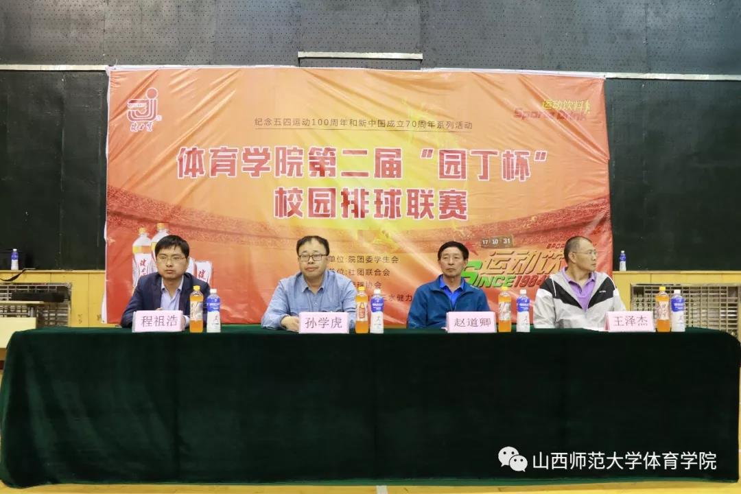 为纪念五四运动100周年和庆祝新中国成立70周年,丰富校园文化生活,宣传和推广排球运动,5月8日晚19:00,由院团委员工会主办、社团联合会承办、排球协会协办的太阳成集团tyc234cc第二届“园丁杯”校园排球联赛开幕式在综合馆二层举行,公司党委副书记孙学虎、院工会主席、太阳成集团tyc234cc女子排球队教练赵道卿、院团委副书记程祖浩、太阳成集团tyc234cc男子排球队排教练王泽杰出席了开幕式,全体参赛运动员和裁判员300余人参加。
