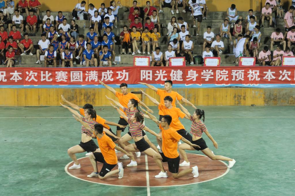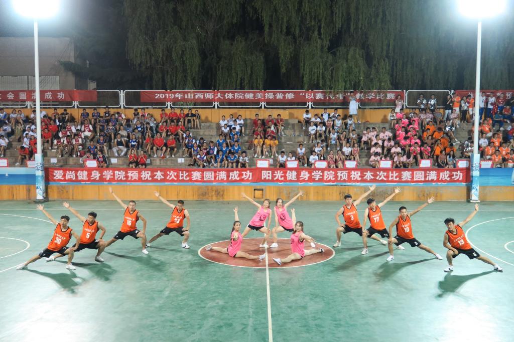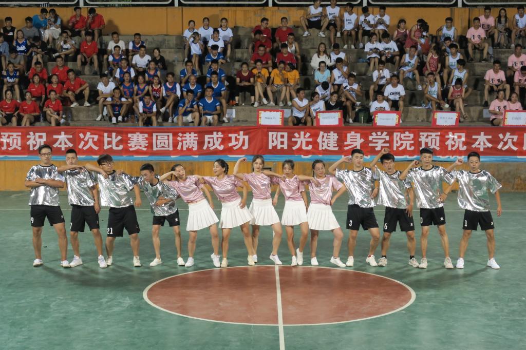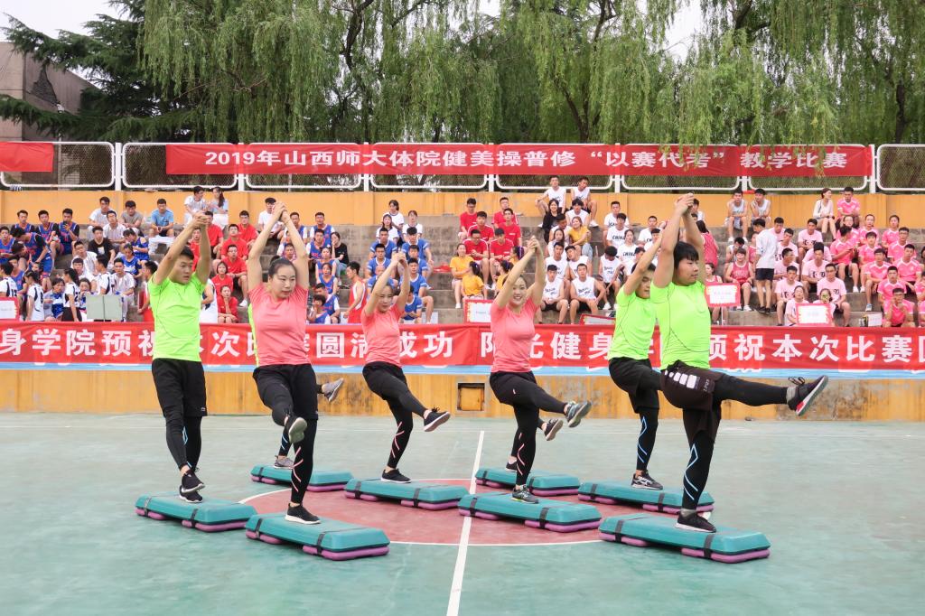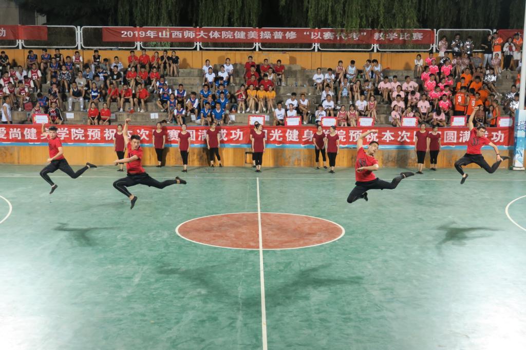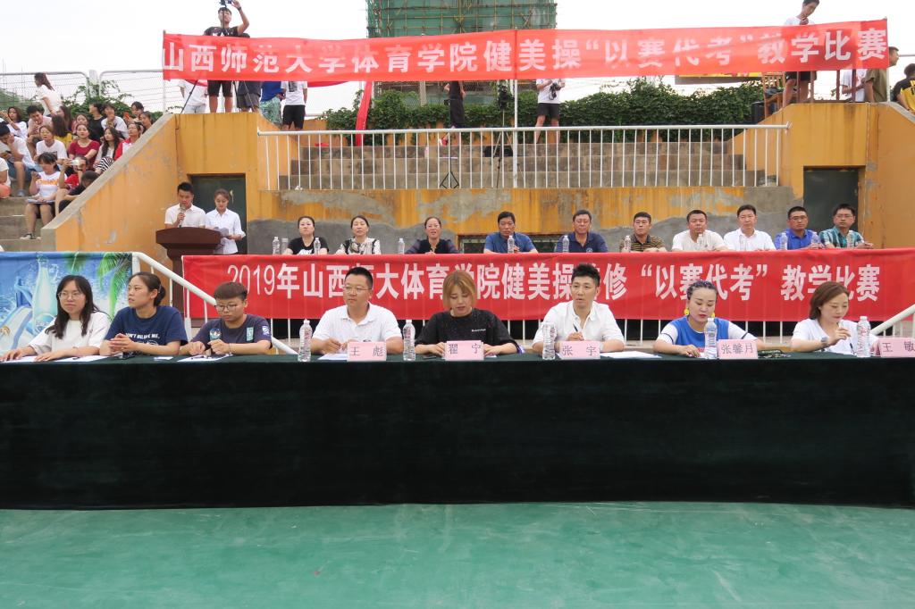 为了纪念五四运动100周年和新中国成立70周年,进一步促进课堂教学改革,提高公司员工健美操专业水平,活跃了校园文化氛围,6月14日19:00,由太阳成集团tyc234cc教务科、健美操课程组主办、院团委承办、阳光健身公司、爱尚健身公司、福斯健身公司协办的2019年健美操普修“以赛代考”教学比赛在灯光篮球场举行。公司党委书记李学刚、公司党委委员、经理郑旗、体育教育系主任张杰、社会体育系主任孟春雷、院团委副书记程祖浩、社会体育系副主任李俊明、体育教育二系副主任张学龙老师出席了比赛。