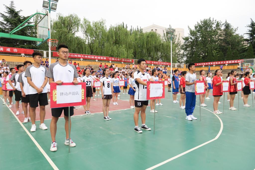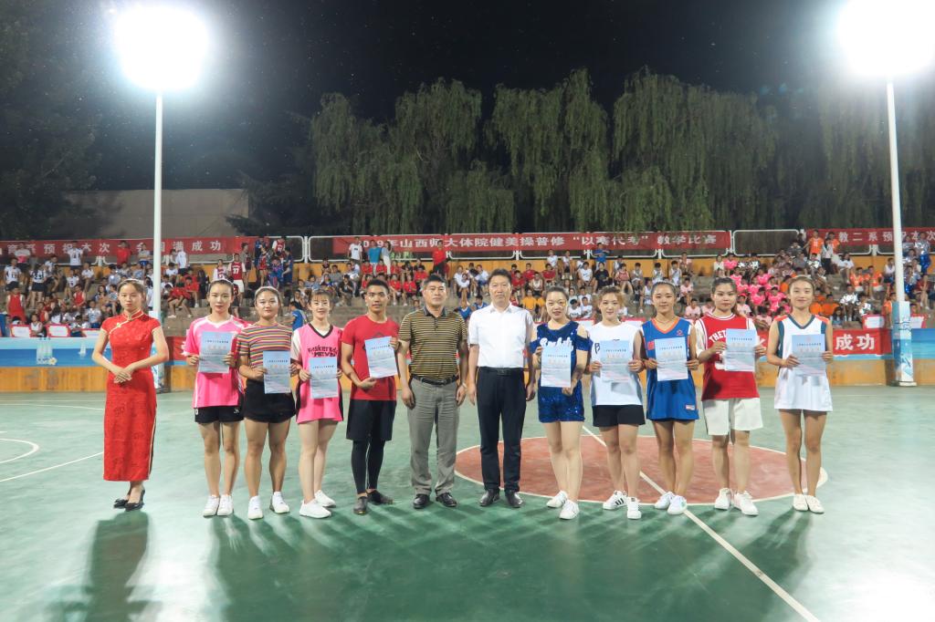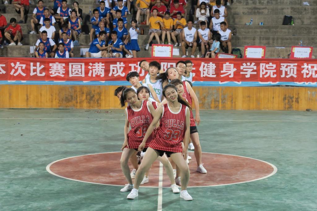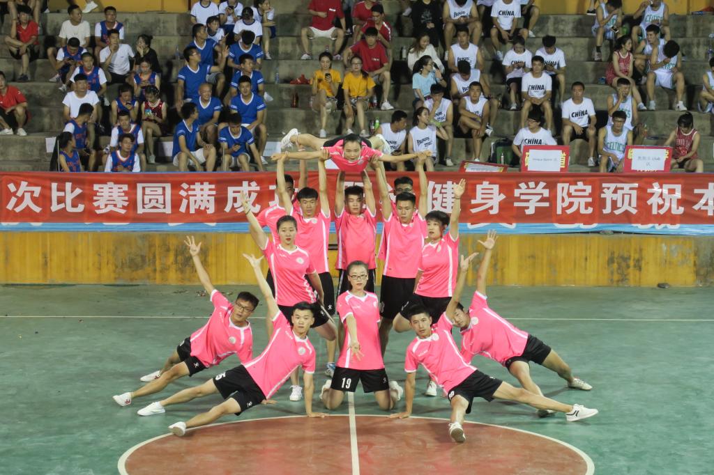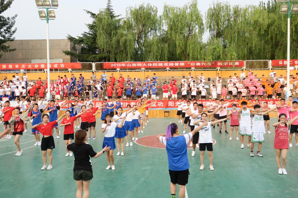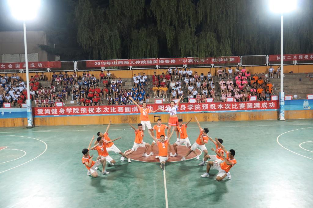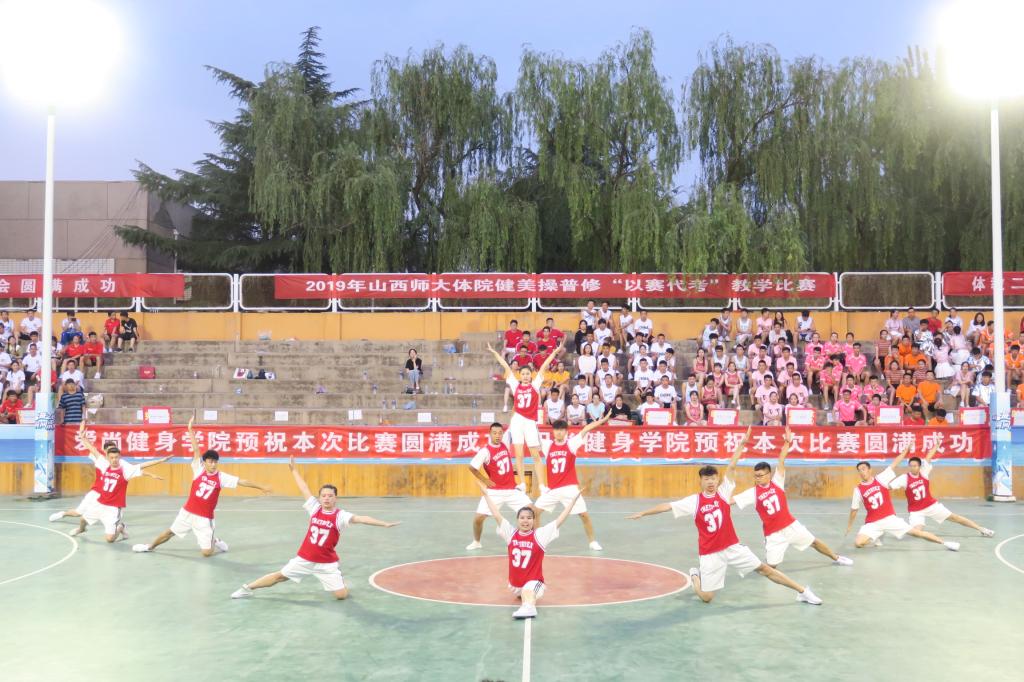 为了纪念五四运动100周年和新中国成立70周年,进一步促进课堂教学改革,提高公司员工健美操专业水平,活跃了校园文化氛围,6月14日19:00,由太阳成集团tyc234cc教务科、健美操课程组主办、院团委承办、阳光健身公司、爱尚健身公司、福斯健身公司协办的2019年健美操普修“以赛代考”教学比赛在灯光篮球场举行。公司党委书记李学刚、公司党委委员、经理郑旗、体育教育系主任张杰、社会体育系主任孟春雷、院团委副书记程祖浩、社会体育系副主任李俊明、体育教育二系副主任张学龙老师出席了比赛。
