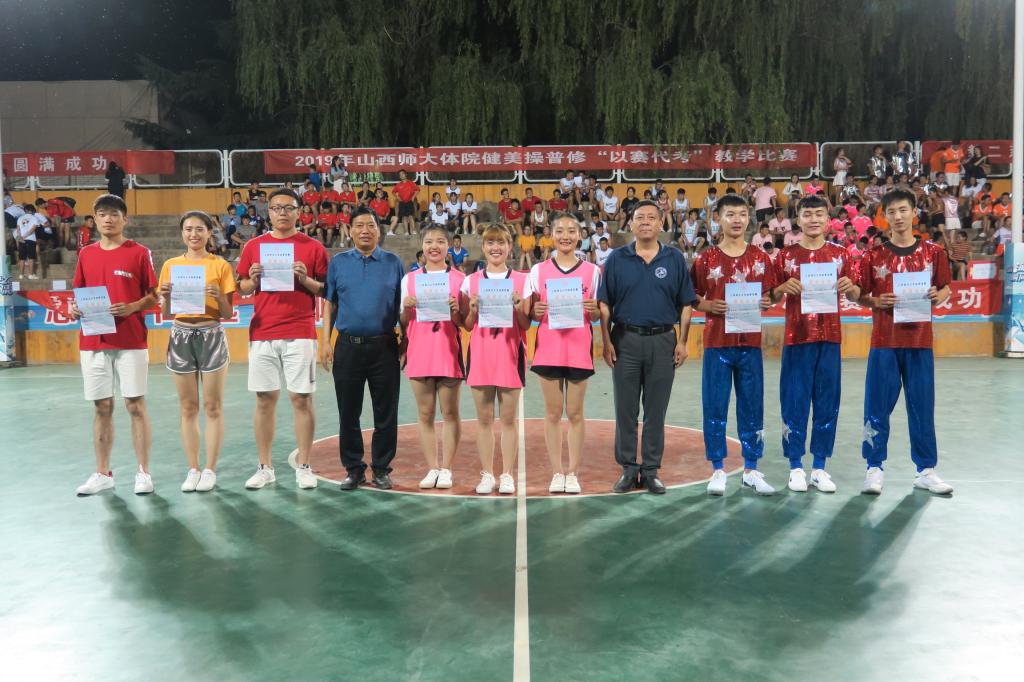 经过激烈的角逐,最终由社体1701班大波浪队,体教1602班爱的魔力转圈圈队,文理1601班特别范儿队获得最佳编排奖,由体教1603班创造奇迹队,最好的我们队,happy队获得最佳表演奖。最后,出席比赛的领导老师为获奖团队颁奖并集体合影留念。