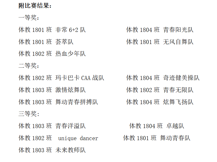 高级裁判组由郭丽娟老师、张秀珍老师、王红芳老师、卫玲玲老师担任。比赛在张宇、张馨月等外聘裁判带来的动感开场舞中拉开序幕。体教18级全体同学分为16支参赛队伍依次上场角逐,最终体教1801班非常6+2队、体教1804班青春阳光队等获得一等奖。参赛队员们的精湛技艺、优美动作、编舞技巧和创作方式等赢得裁判组及观众的一致好评与赞扬。