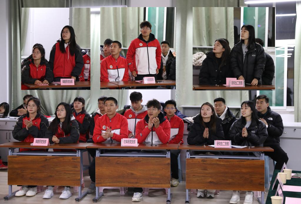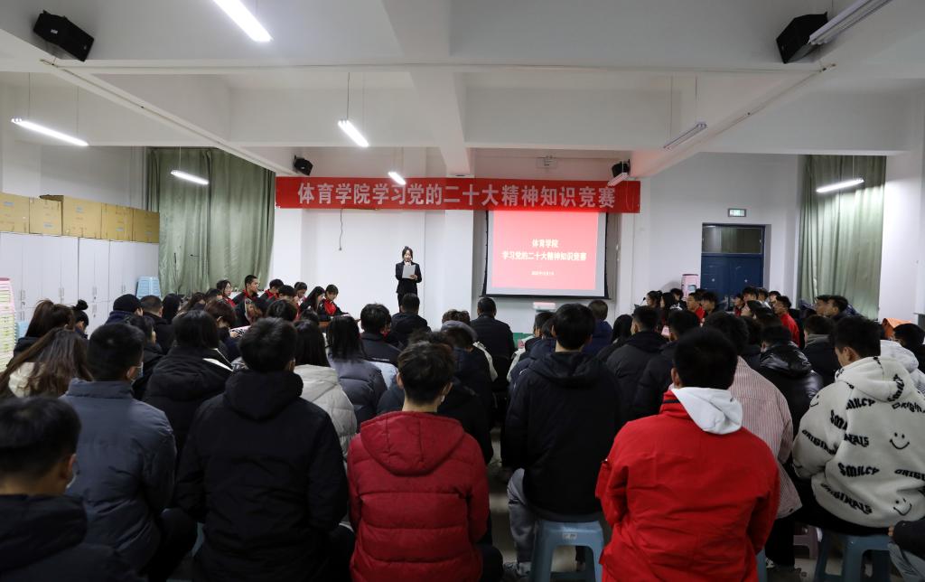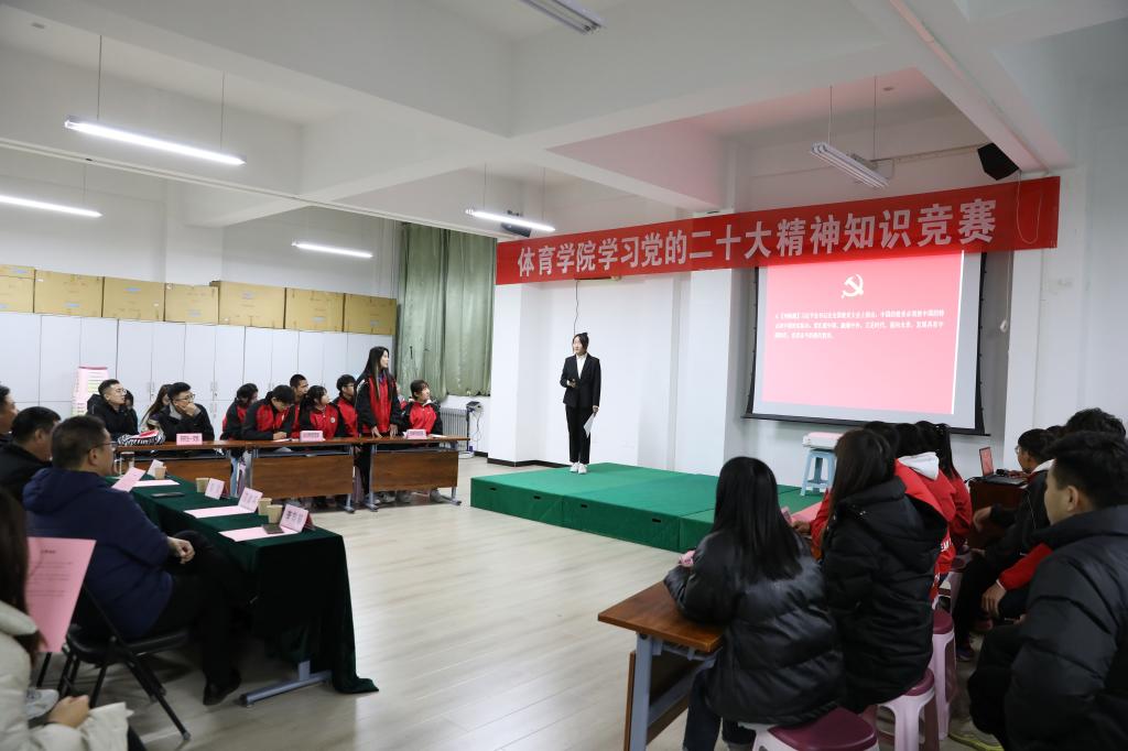 12月1日晚,太阳成集团tyc234cc“学习党的二十大精神”知识竞赛活动决赛在运动心理实验室举行。公司党委书记卫建平,经理郑旗,副经理李向前、孟春雷,体育教育系党支部书记张杰、社会体育系党支部书记李俊明、武术与民族传统体育系党支部书记权黎明、运动训练系党支部副书记卫玲玲、研究生第一党支部书记王丽娜等现场观看比赛。