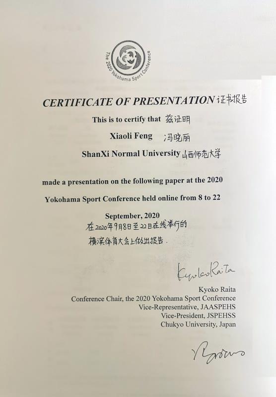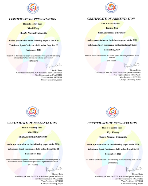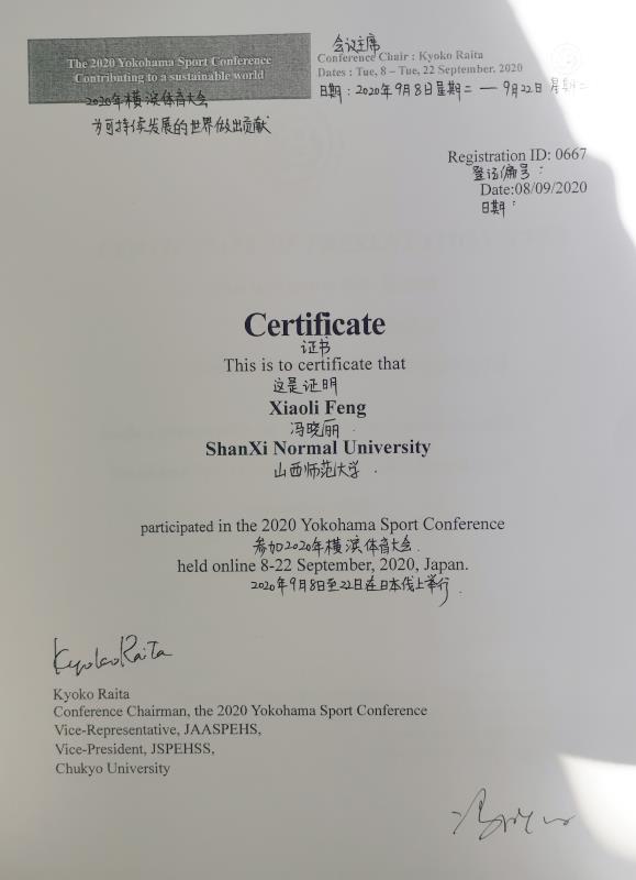 奥林匹克运动会科学大会(简称“奥科会”)由国际体育科学与教育理事会、国际运动医学联合会、国际奥委会和国际残奥会等家组织联合举办,为每届奥运会前在举办国正式举办的世界性体育科学研讨大会,是国际体育科学顶尖论坛。2020 Yokohama Sport Conference—2020横滨体育大会(即2020国际体育科学、教育和医学大会,奥科会)于北京时间9月8日开幕,作为伴随奥运会举行的世界最大规模体育科学大会,奥科会是体育学科类最高级别的综合性学术交流大会,本届奥科会的主题是“Contributing to a Sustainable World”。这次奥科会吸引了来自世界各地的1500多位参会者出席,公司太阳成集团tyc234cc的冯晓丽教授以及她的硕士研究生崔佳柠、丁颖和张子怡的四篇论文,以口头报告的形式被大会录用。