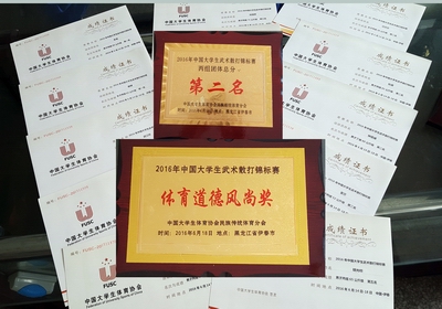 经过6天的激烈角逐,公司选手不畏强手,敢打敢拼,顽强拼搏,在教练员权黎明副教授的带领下取得了优异的成绩。最终获得丙组(民族传统体育专业组)团体总分第二名,丁组(现役散打专业运动员组)团体第五名以及荣获“体育道德风尚奖运动队”的骄人战绩。其中:民体系12级的李龙同学荣获“男子丙组90kg级”的冠军、民体系的13级武江玲同学荣获“女子丙组56kg级”的冠军、民体系的13级谢婵同学荣获“女子丙组65kg级”的冠军、民体系的15级汪莎莎同学荣获“女子丙组48kg级”的亚军、民体系的13级董莎同学荣获“女子丙组52kg级”的亚军、民体系的13级杜森同学荣获“男子丙组85kg级”的亚军、民体系的15级钟震威同学荣获“男子丁组60kg级”的亚军、民体系的13级张孟飞同学荣获“男子丁组70kg级”的季军、民体系的13级孙晨蕊同学荣获“女子丙组60kg级”的季军、民体系的13级刘佳林同学荣获“男子丙组75kg级”的季军、民体系的12级胡光标同学荣获“男子丙组65kg级”的第五名、民体系的15级柳旭东同学荣获“男子丙组56kg级”的第五名、民体系的柳旭东同学荣获“体育道德风尚运动员”称号。