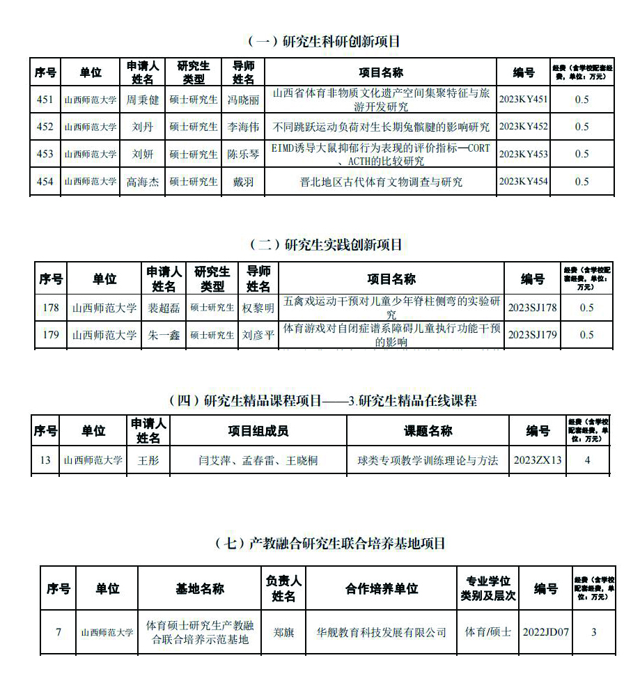 近日,山西省教育厅公布了2023年度研究生教育创新计划各类项目名单(晋教研[2023]2号),公司王彤教授获批研究生精品课程项目—研究生精品在线课程,硕士研究生周秉健等4位同学获批研究生科研创新项目,硕士研究生裴超磊等2位同学获批研究生实践创新项目,郑旗教授负责的体育硕士研究生产教融合联合培养示范基地获批产教融合研究生联合培养基地项目。(院研究生部供稿)